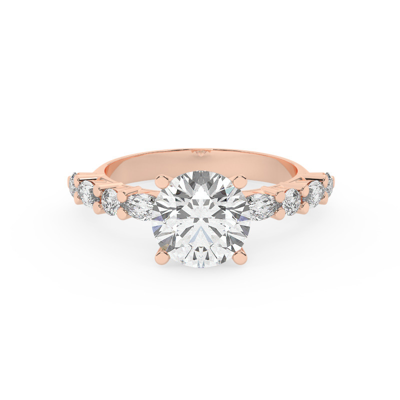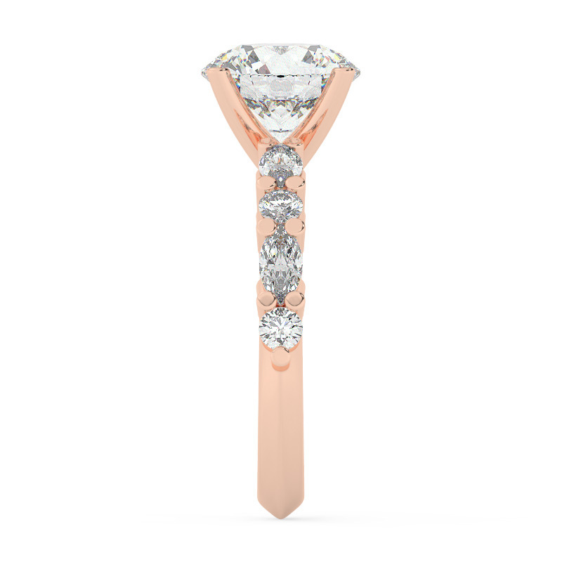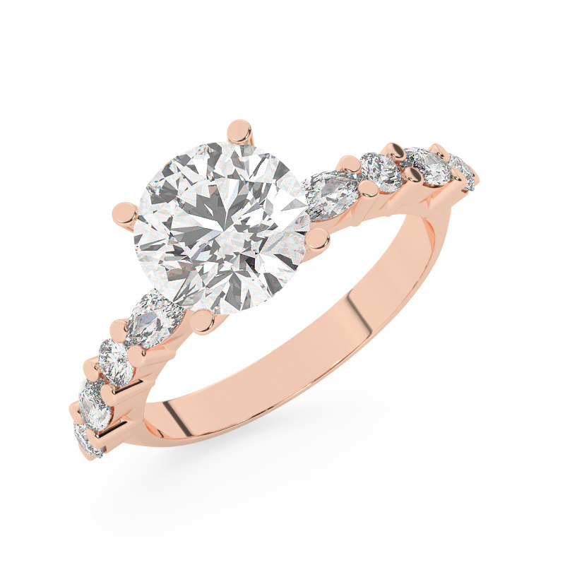 טבעת אירוסין סוליטר ויהלומים בצדדים דגם 50068 כסף מצופה זהב אדום רוזגולד במרכז אבן מעבדה מוסונייט 3 קראט בחיתוך עגול עם תעודה גמולוגית בינלאומית GRA מסביב ובצדדים אבני מעבדה מוסונייט במשקל של 0.40 קראט בנוסף 0.20 קראט