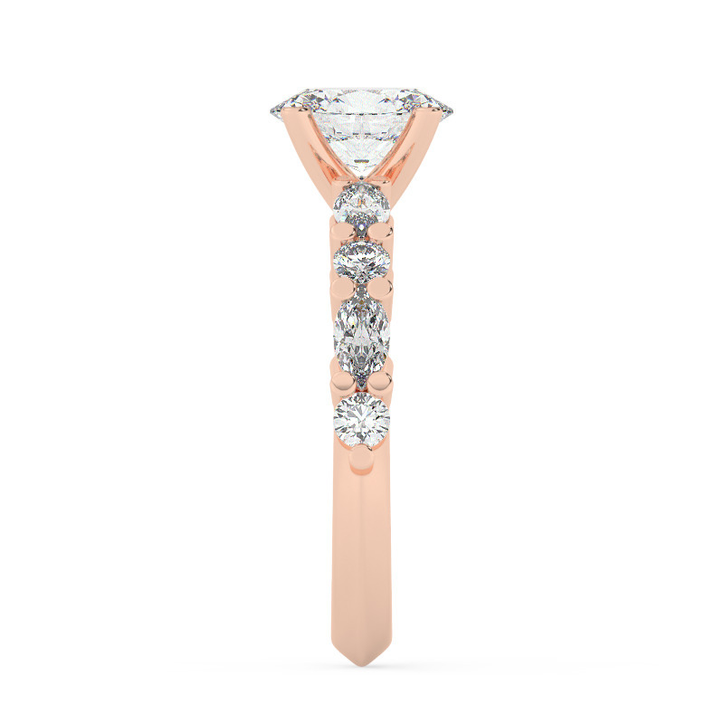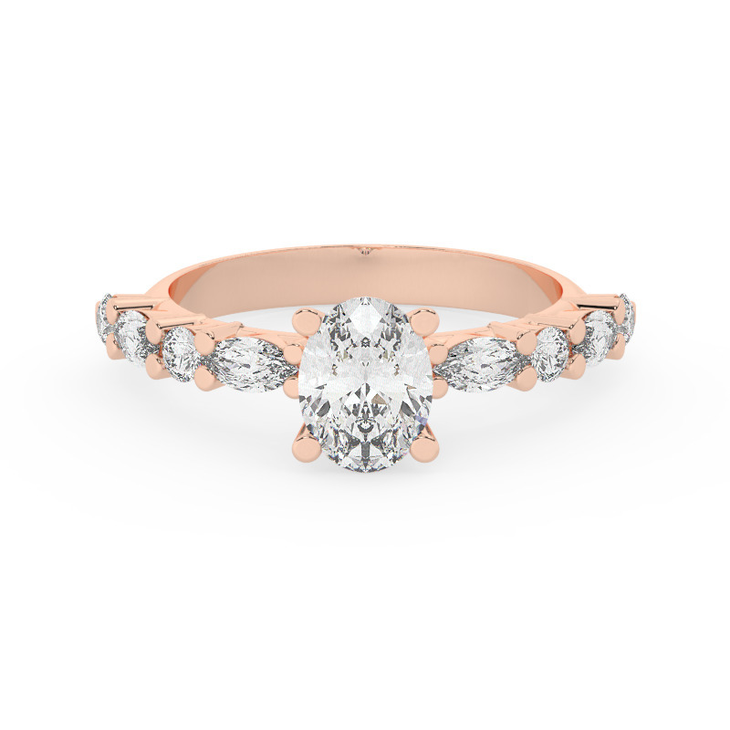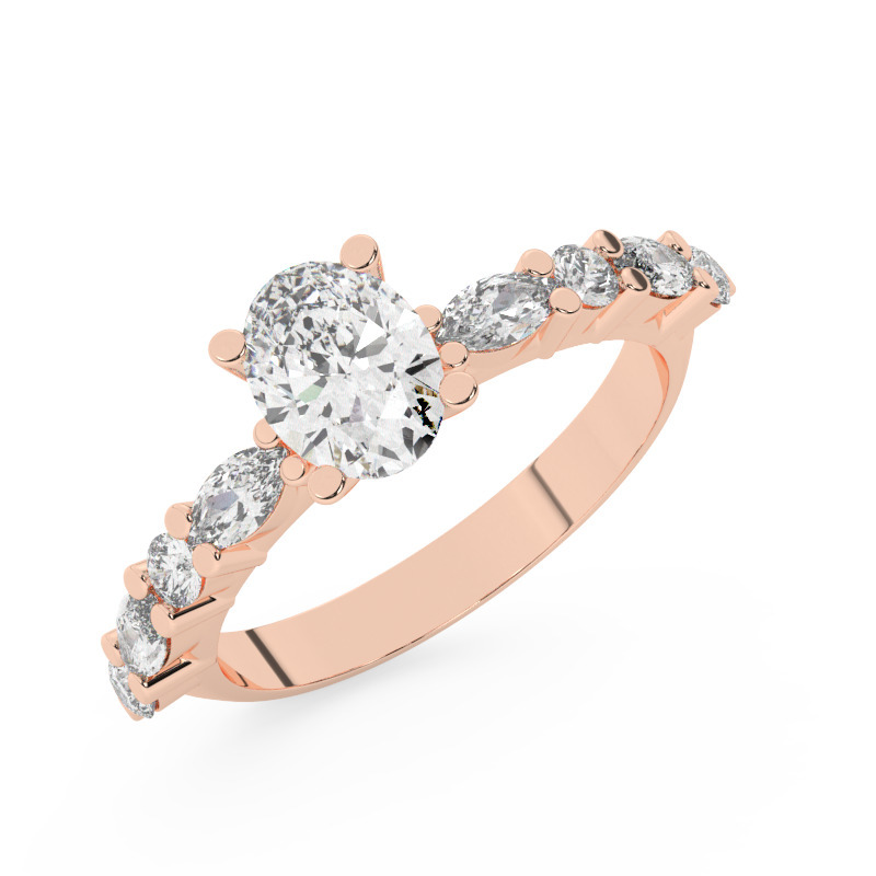טבעת אירוסין סוליטר ויהלומים בצדדים דגם 50068 כסף מצופה זהב אדום רוזגולד במרכז יהלום מעבדה 1.50 קראט בחיתוך אובל עם תעודה גמולוגית אירופאית IGI מסביב ובצדדים יהלומי מעבדה במשקל של 0.40 קראט בנוסף 0.20 קראט