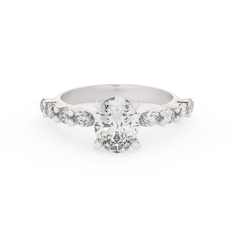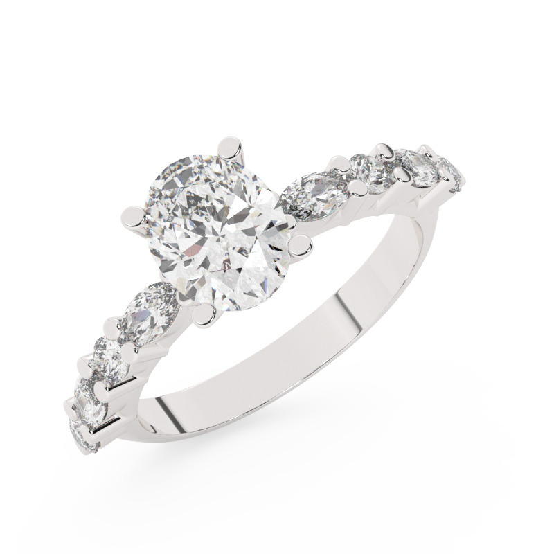 טבעת אירוסין סוליטר ויהלומים בצדדים דגם 50068 כסף מצופה זהב לבן במרכז יהלום מעבדה 2 קראט בחיתוך אובל עם תעודה גמולוגית אירופאית IGI מסביב ובצדדים יהלומי מעבדה במשקל של 0.40 קראט בנוסף 0.20 קראט
