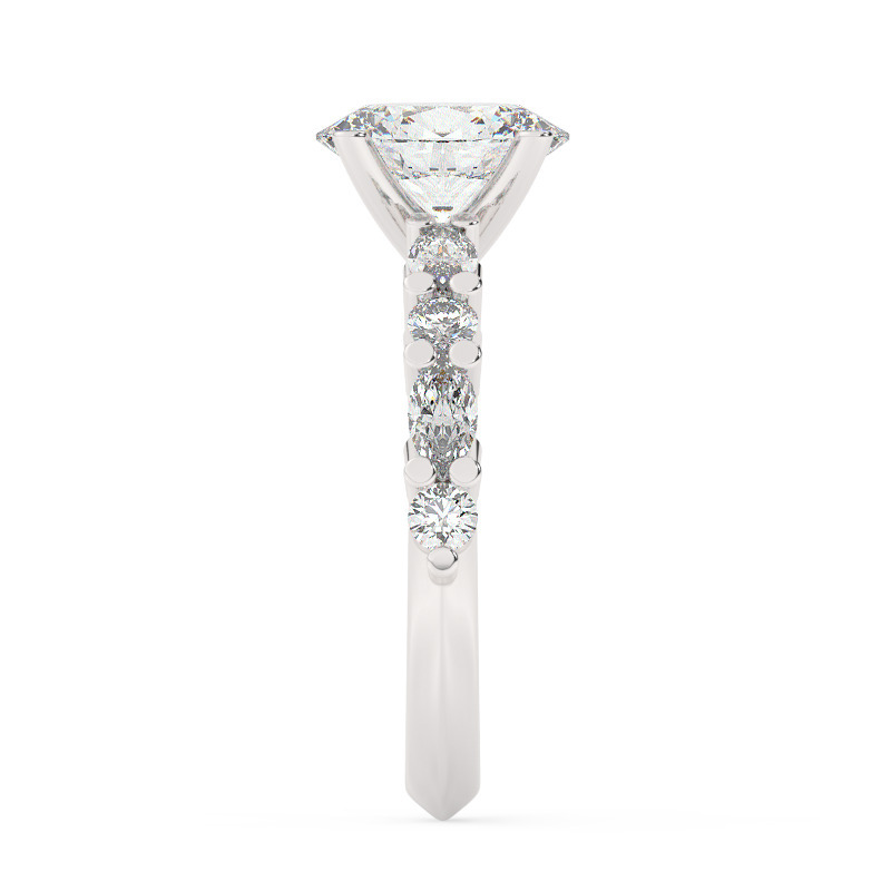 בנוסף ליהלום המרכזי המדהים, הטבעת הזו מציעה גם 8 אבנים צדדיות בגודלים שונים – ארבע אבני מרקיזה שכוללות 0.40 קרט של יהלומי מעבדה ואבן עגולה נוספת בקוטר של 0.20 קרט. כל אחת מהאבנים הצדדיות שומרת על צבע E וניקיון VS1, מה שמבטיח שהטבעת לא רק תראית מעולה אלא גם תוחזק לאורך שנים רבות.