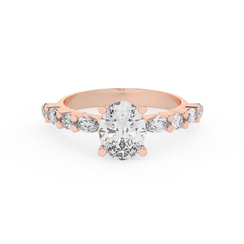 טבעת אירוסין סוליטר ויהלומים בצדדים דגם 50068 כסף מצופה זהב אדום רוזגולד במרכז יהלום מעבדה 2 קראט בחיתוך אובל עם תעודה גמולוגית אירופאית IGI מסביב ובצדדים יהלומי מעבדה במשקל של 0.40 קראט בנוסף 0.20 קראט