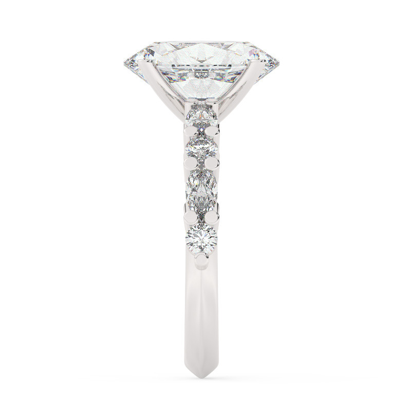 אבן המוסונייט המרכזית מוקפת בקטע של ארבע אבנים נוספות בעיצוב מרקיזה וארבע אבנים עגולות, המוסיפות להרמוניה ולתחושת המראה המבריק של הטבעת הכוללת תשעה אבנים בסך הכל. כל אחת מהאבנים הצדדיות גם היא בעלת צבע D ובהירות VVS1, כך שתקבלו עיטור שלם המעניק לקסם של הטבעת העצמת רגש ופאר.