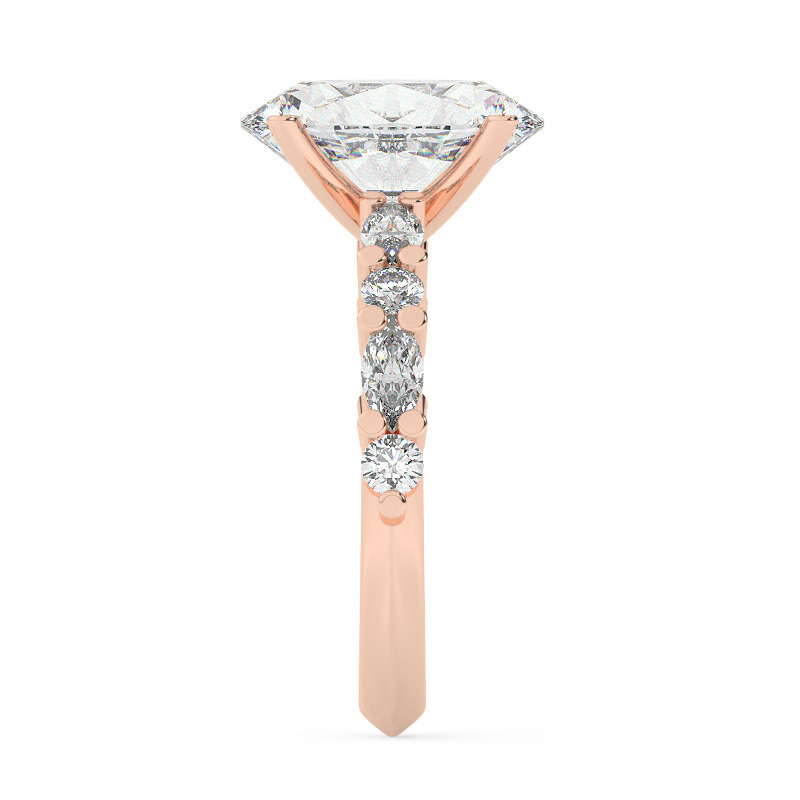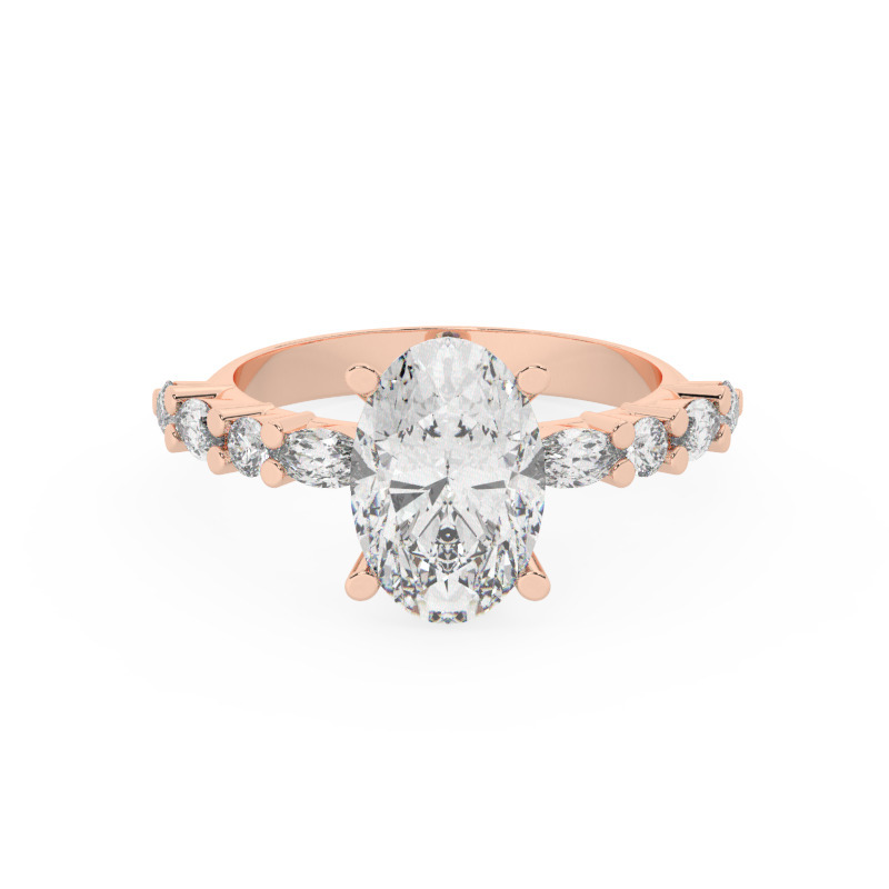 טבעת אירוסין סוליטר ויהלומים בצדדים דגם 50068 כסף מצופה זהב אדום רוזגולד במרכז אבן מעבדה מוסונייט 3 קראט בחיתוך אובל עם תעודה גמולוגית בינלאומית GRA מסביב ובצדדים אבני מעבדה מוסונייט במשקל של 0.40 קראט בנוסף 0.20 קראט