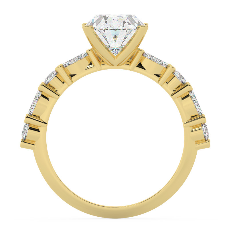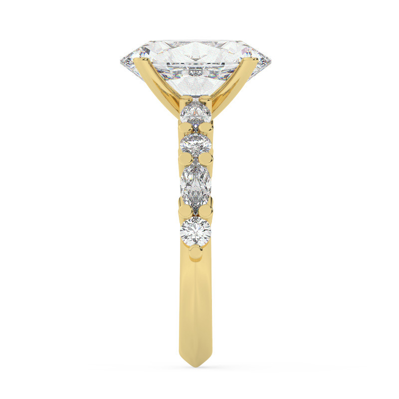 לצידה של האבן המרכזית, נמצא תכנון של 8 אבני צד – 4 מרקיזות ושאר 4 עגולות, כולם יהלומים מעבדה בטעמה ובצבעה. כל אבן צד מעוצבת עם הקפיצות של איכות, כשרצינו להעשיר את הטבעת במרקם מיוחד ומגע יוקרתי. כל אבנת יהלום מעבדה באותה איכות ובאותו צבע, יוצרת תיאוריה מושלמת של הרמוניה ואלגנטיות.