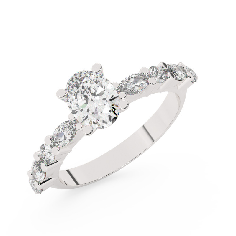 טבעת אירוסין סוליטר ויהלומים בצדדים דגם 50068 כסף מצופה זהב לבן במרכז יהלום מעבדה 0.75 קראט בחיתוך אובל עם תעודה גמולוגית מסביב ובצדדים יהלומי מעבדה במשקל של 0.40 קראט בנוסף 0.20 קראט