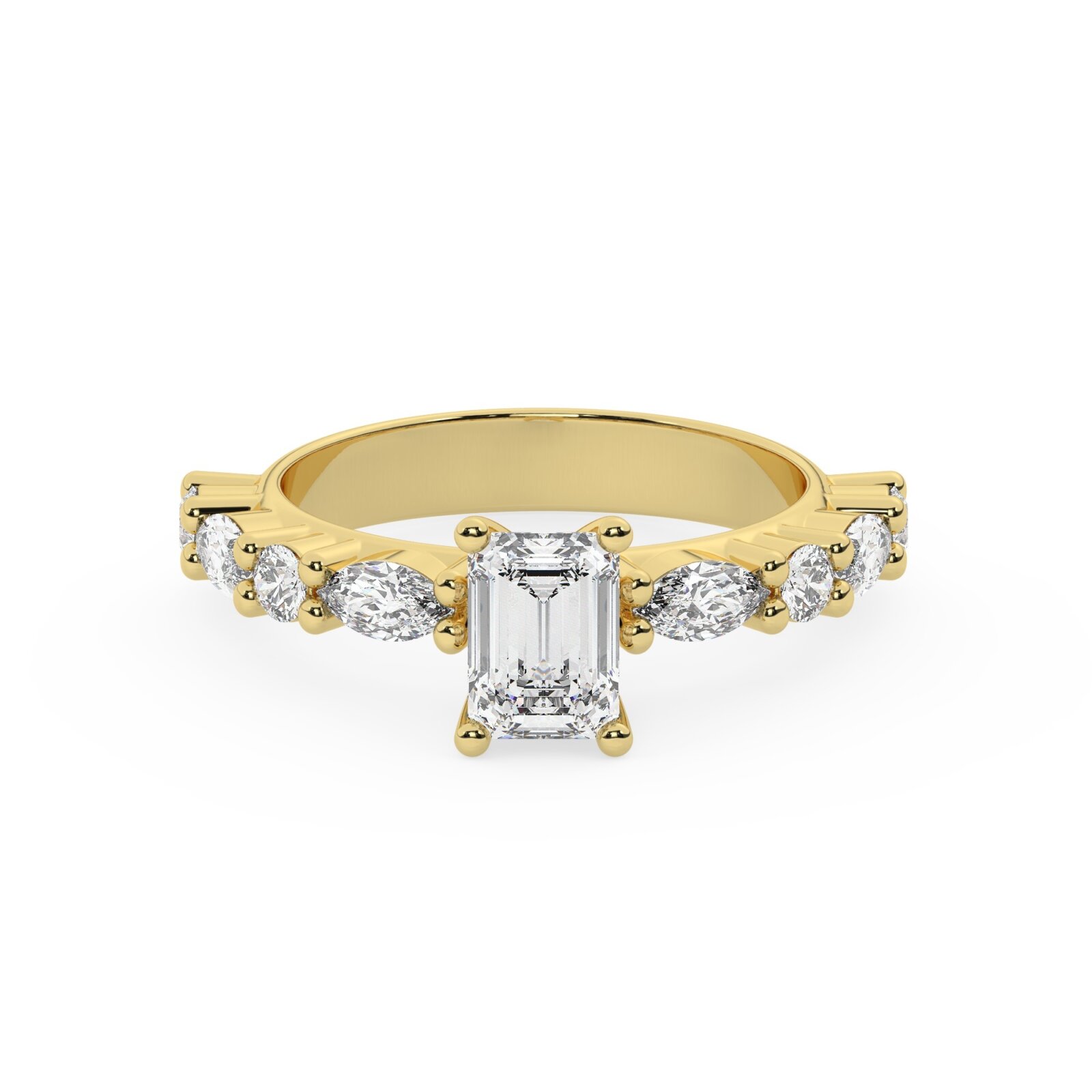 טבעת אירוסין סוליטר ויהלומים בצדדים דגם 50068 כסף מצופה זהב צהוב במרכז יהלום מעבדה 1 קראט בחיתוך אמרלד עם תעודה גמולוגית אירופאית IGI מסביב ובצדדים יהלומי מעבדה במשקל של 0.40 קראט בנוסף 0.20 קראט