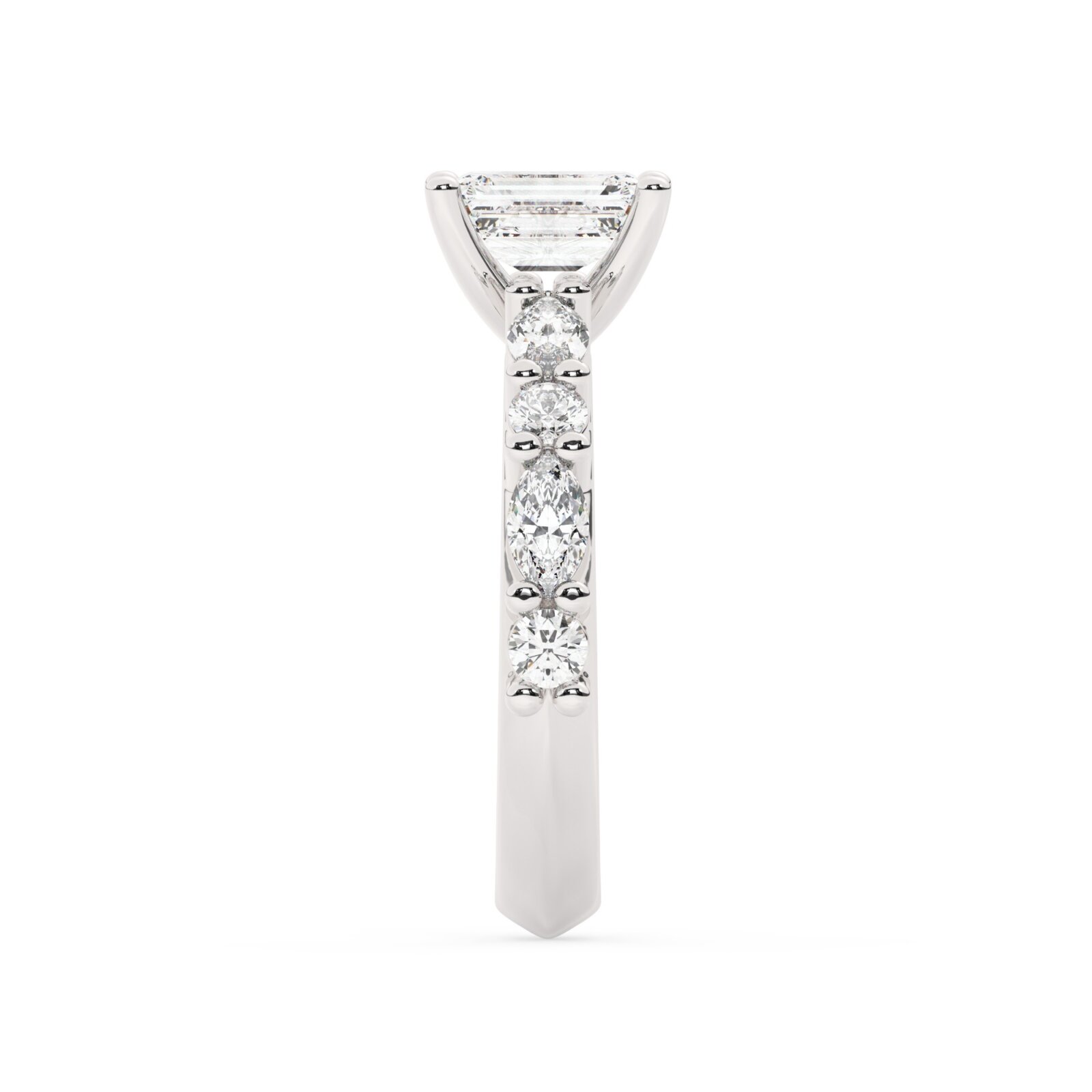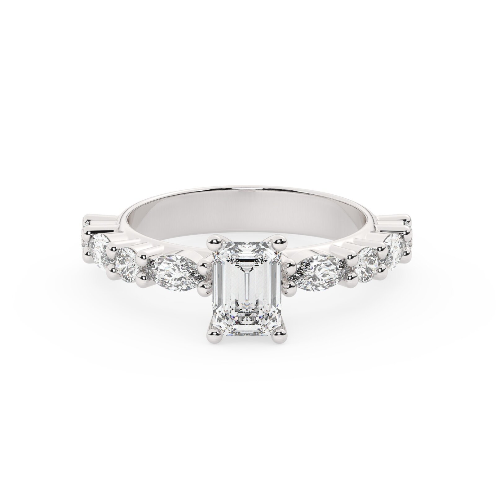 טבעת אירוסין סוליטר ויהלומים בצדדים דגם 50068 כסף מצופה זהב לבן במרכז יהלום מעבדה 1.50 קראט בחיתוך אמרלד עם תעודה גמולוגית אירופאית IGI מסביב ובצדדים יהלומי מעבדה במשקל של 0.40 קראט בנוסף 0.20 קראט