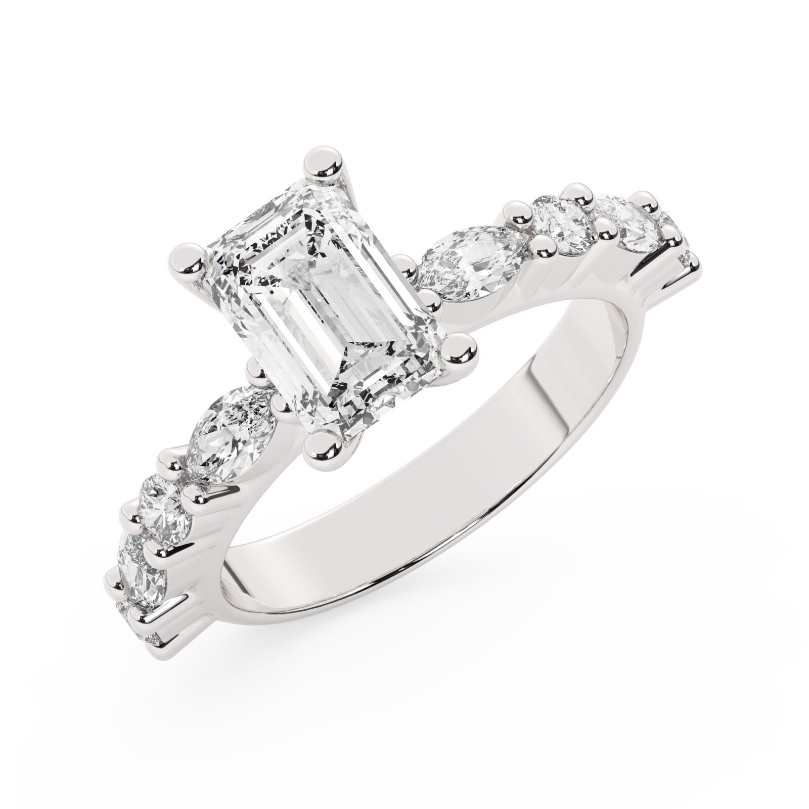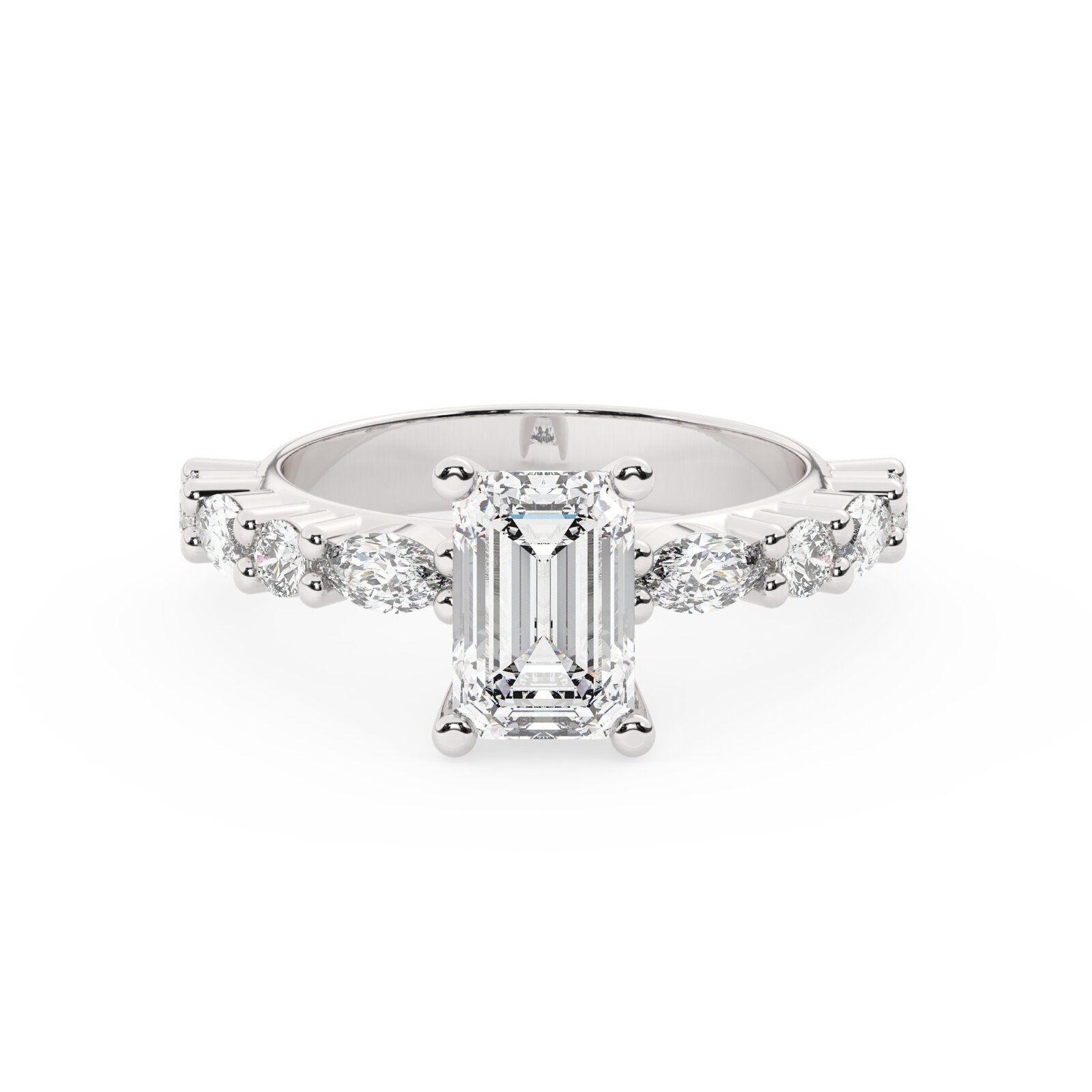 טבעת אירוסין סוליטר ויהלומים בצדדים דגם 50068 כסף מצופה זהב לבן במרכז יהלום מעבדה 2 קראט בחיתוך אמרלד עם תעודה גמולוגית אירופאית IGI מסביב ובצדדים יהלומי מעבדה במשקל של 0.40 קראט בנוסף 0.20 קראט