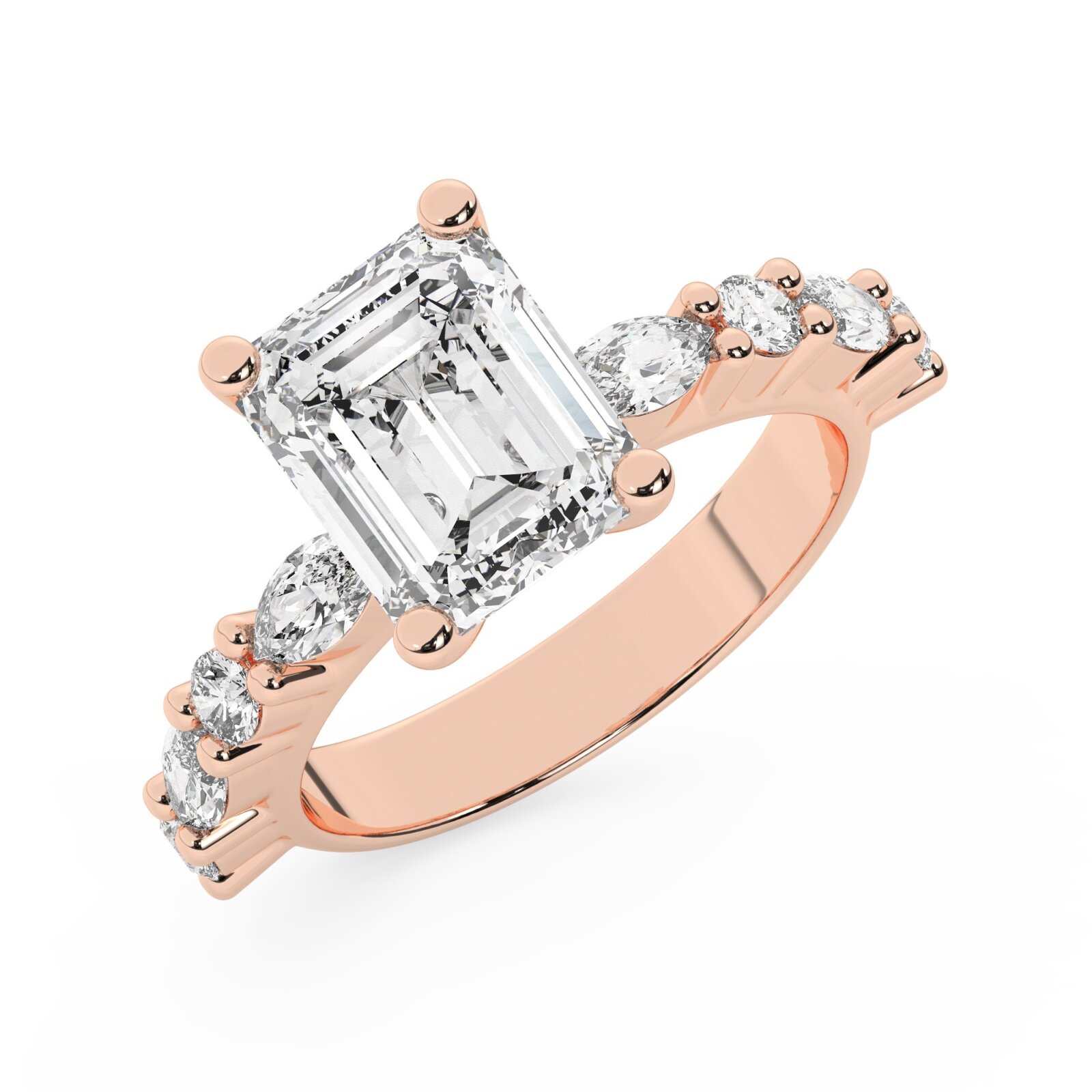 טבעת אירוסין סוליטר ויהלומים בצדדים דגם 50068 כסף מצופה זהב אדום רוזגולד במרכז יהלום מעבדה 3 קראט בחיתוך אמרלד עם תעודה גמולוגית אירופאית IGI מסביב ובצדדים יהלומי מעבדה במשקל של 0.40 קראט בנוסף 0.20 קראט