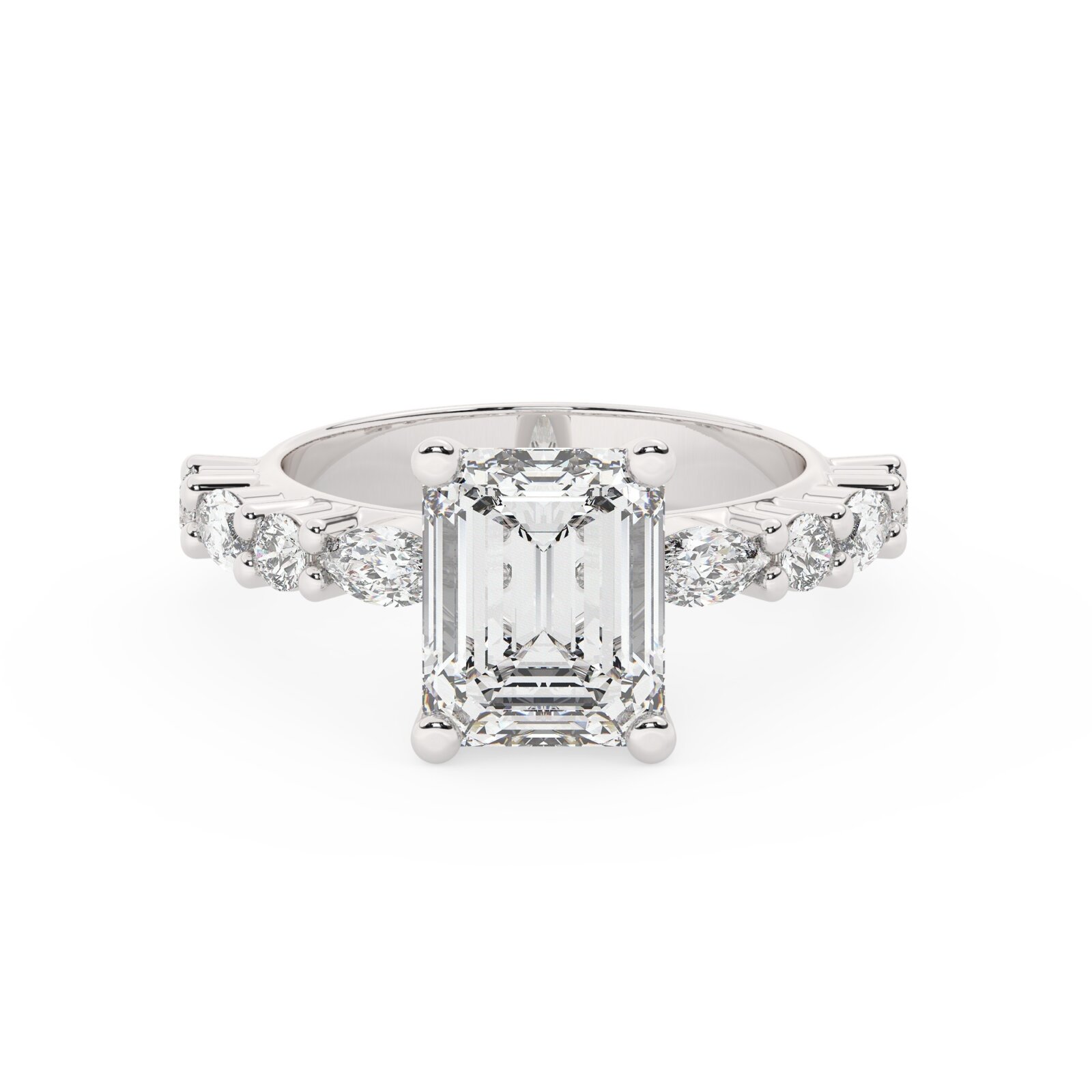 האבנים היפהפיות מסודרות בצורה מעודנת סביב האבן המרכזית, כאשר בכל צד ישנן 4 אבנים נוספות – 4 אבני מוסונייט בצורה מרקיזה עם משקל כולל של 0.40 קראט, וכן 4 אבני מוסונייט נוספות בצורה עגלית במשקל 0.20 קראט. כל פרט בטבעת זו נבנה במחשבה עליך, בשביל לגלות את היופי שנושא את הסיפור של אהבה נצחית.