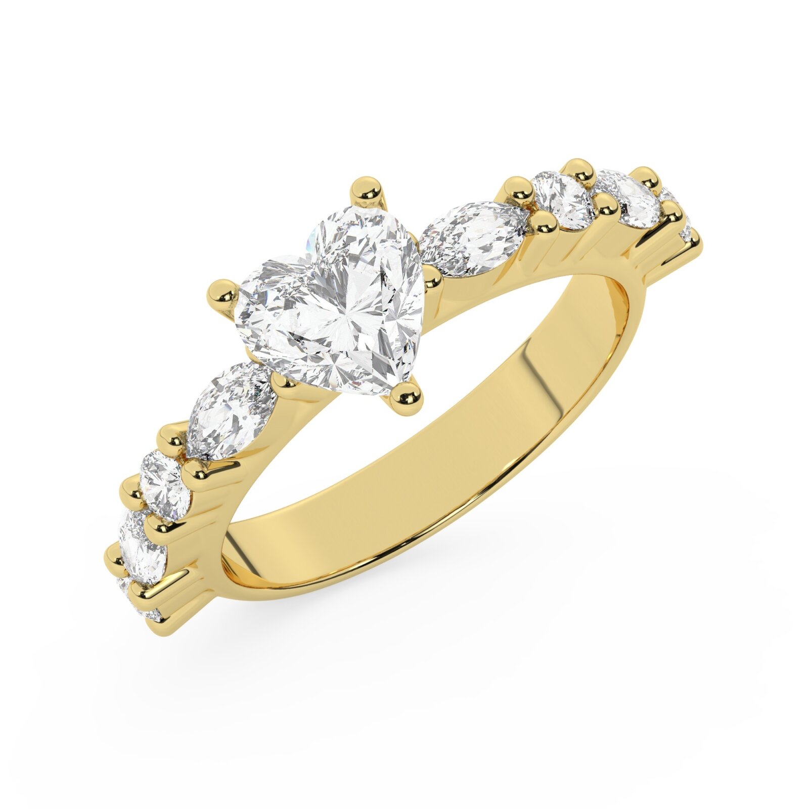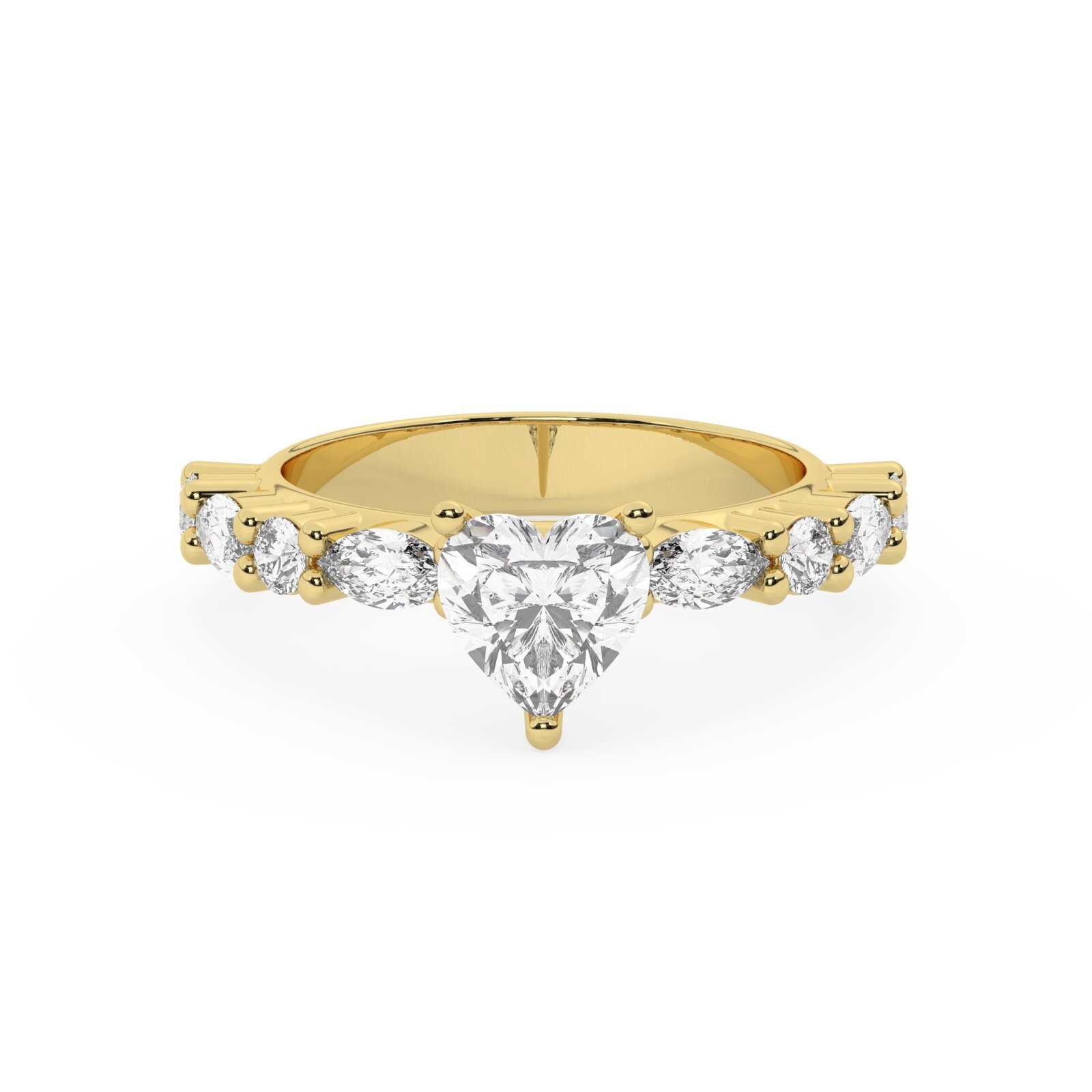 טבעת אירוסין סוליטר ויהלומים בצדדים דגם 50068 כסף מצופה זהב צהוב במרכז יהלום מעבדה 4 קראט בחיתוך לב עם תעודה גמולוגית אירופאית IGI מסביב ובצדדים יהלומי מעבדה במשקל של 0.40 קראט בנוסף 0.20 קראט