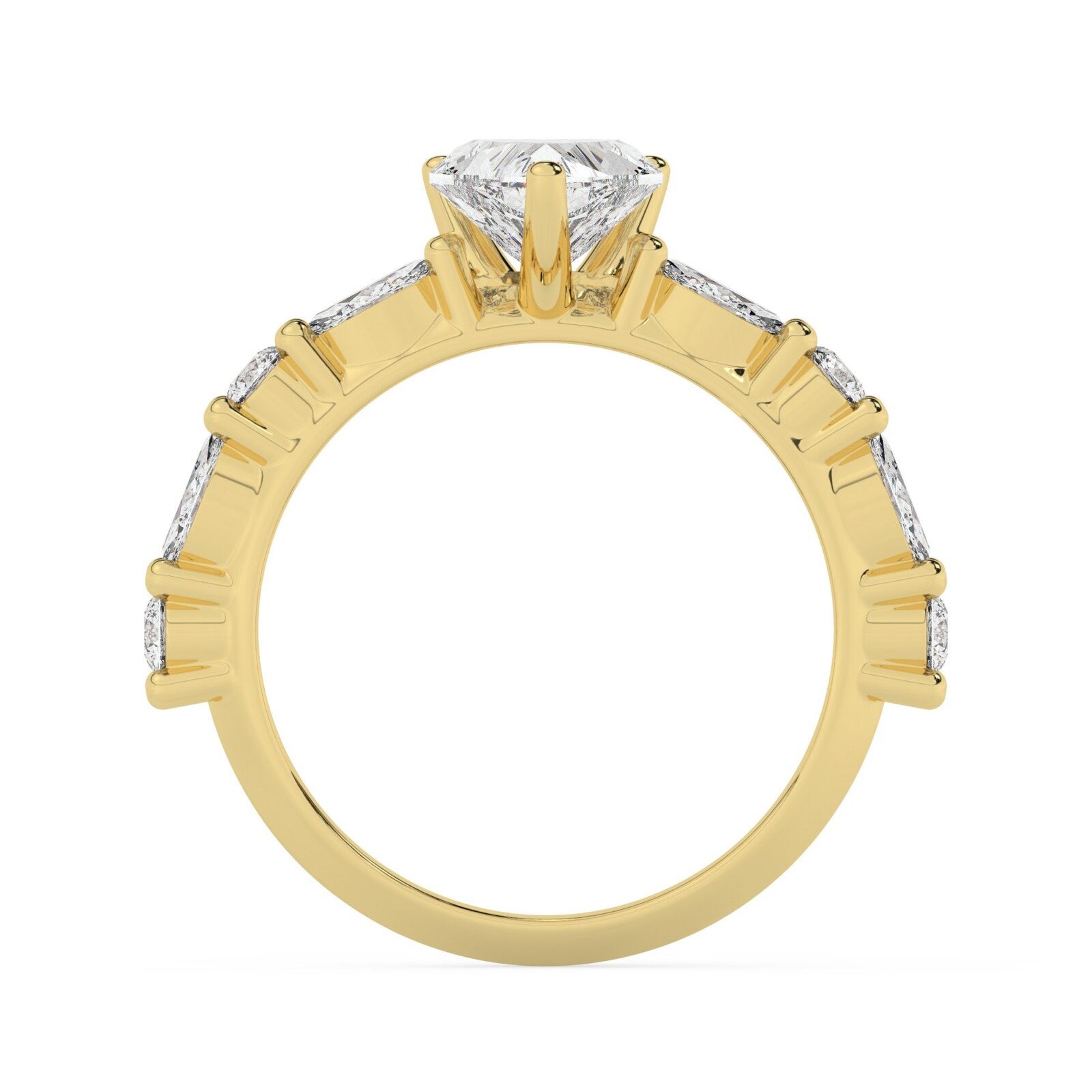 מסביב ליהלום המרכזי, שולבו ארבע אבני צד בצורת מרקיזה, שכל אחת מהן משקל של 0.40 קראט, המשלימות את המראה המושלם של הטבעת. אבני צד אלו כוללות גם את אותם סטנדרטים מחמירים של צבע וניקיון, ובכך יוצרות השתקפות קסומה של אור. בנוסף, ישנם ארבע אבני צד עגולות, במשקל של 0.20 קראט כל אחת, המוסיפות למראה הכללי של הטבעת והופכות אותה למוקד של תשומת לב.