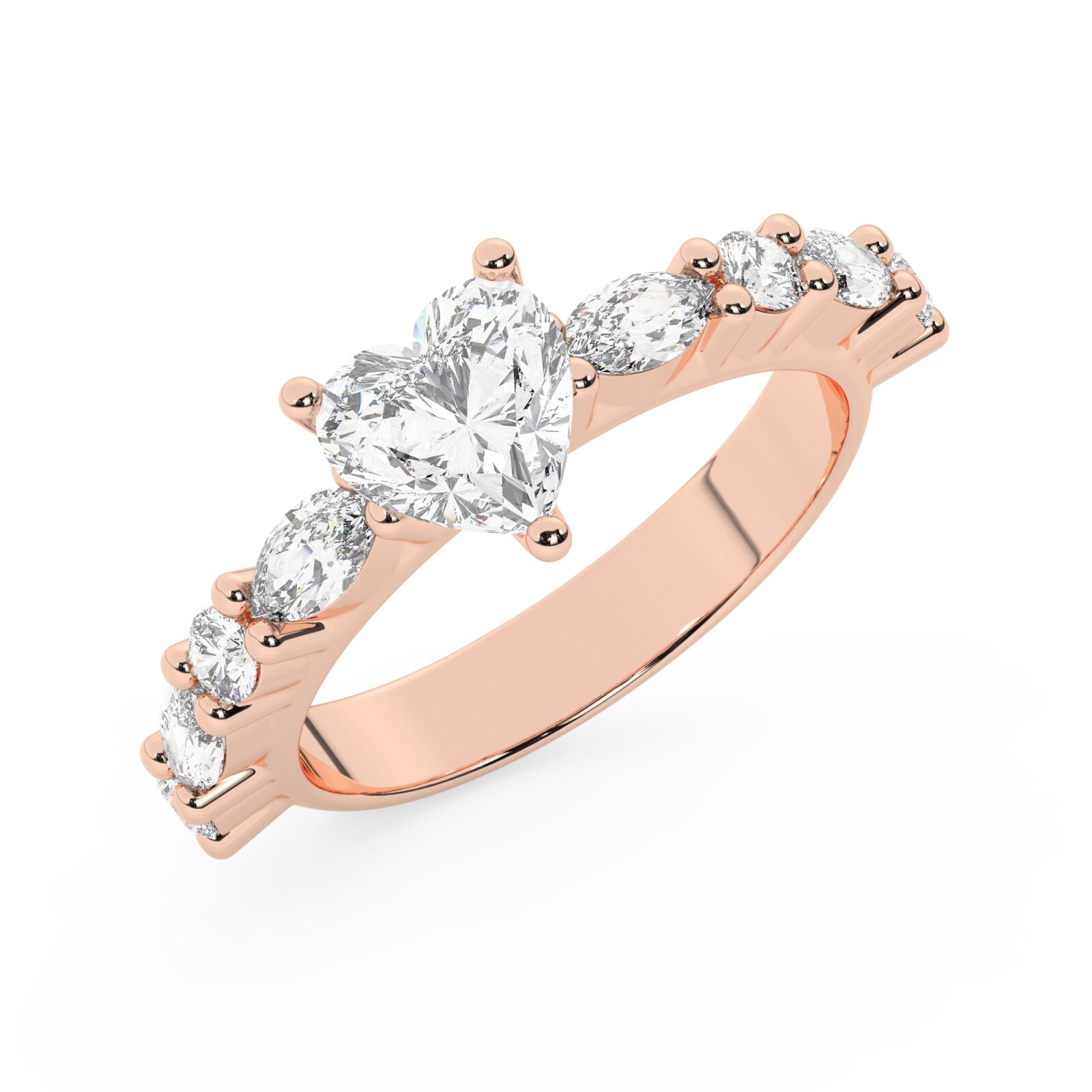 טבעת אירוסין סוליטר ויהלומים בצדדים דגם 50068 כסף מצופה זהב אדום רוזגולד במרכז יהלום מעבדה 4 קראט בחיתוך לב עם תעודה גמולוגית אירופאית IGI מסביב ובצדדים יהלומי מעבדה במשקל של 0.40 קראט בנוסף 0.20 קראט