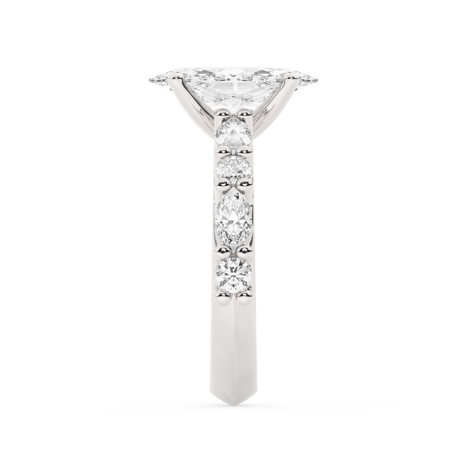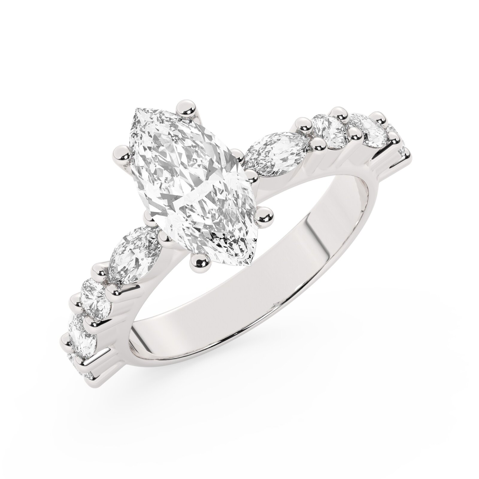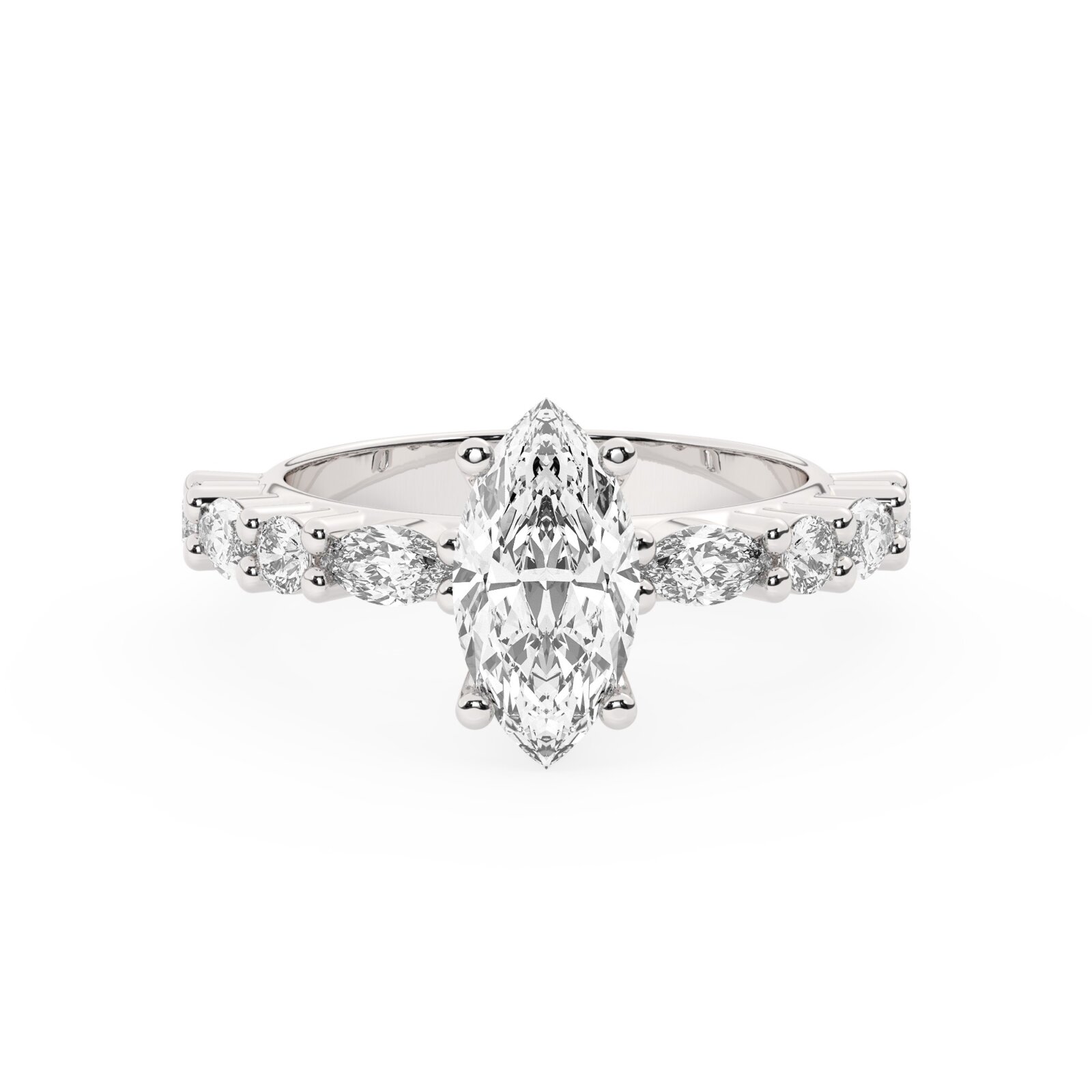 טבעת אירוסין סוליטר ויהלומים בצדדים דגם 50068 כסף מצופה זהב לבן במרכז יהלום מעבדה 2.50 קראט בחיתוך מרקיזה עם תעודה גמולוגית אירופאית IGI מסביב ובצדדים יהלומי מעבדה במשקל של 0.40 קראט בנוסף 0.20 קראט