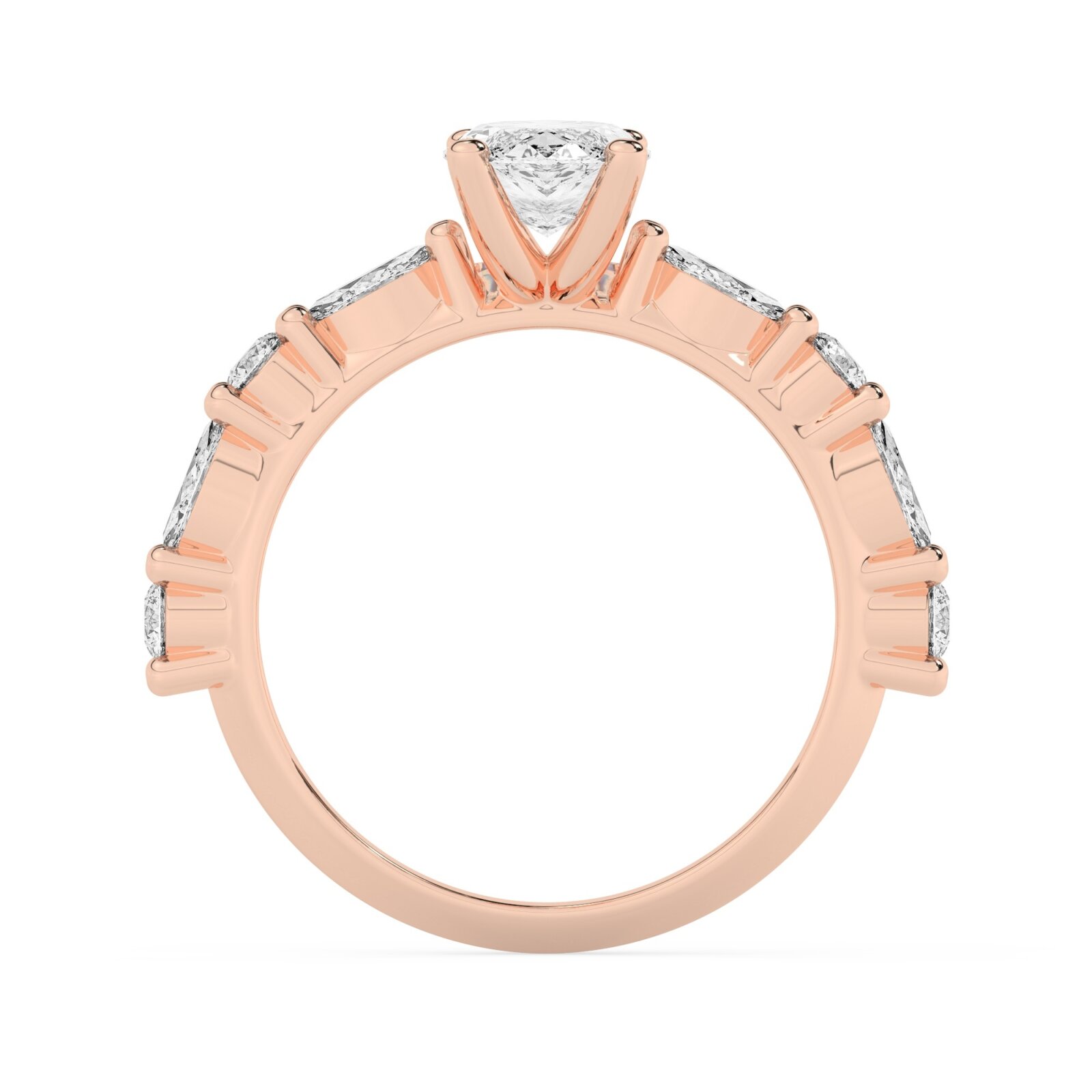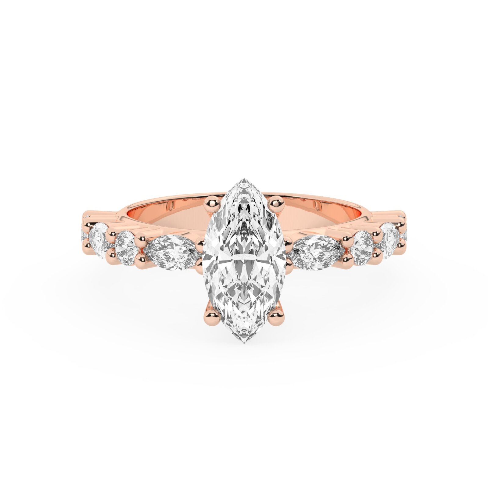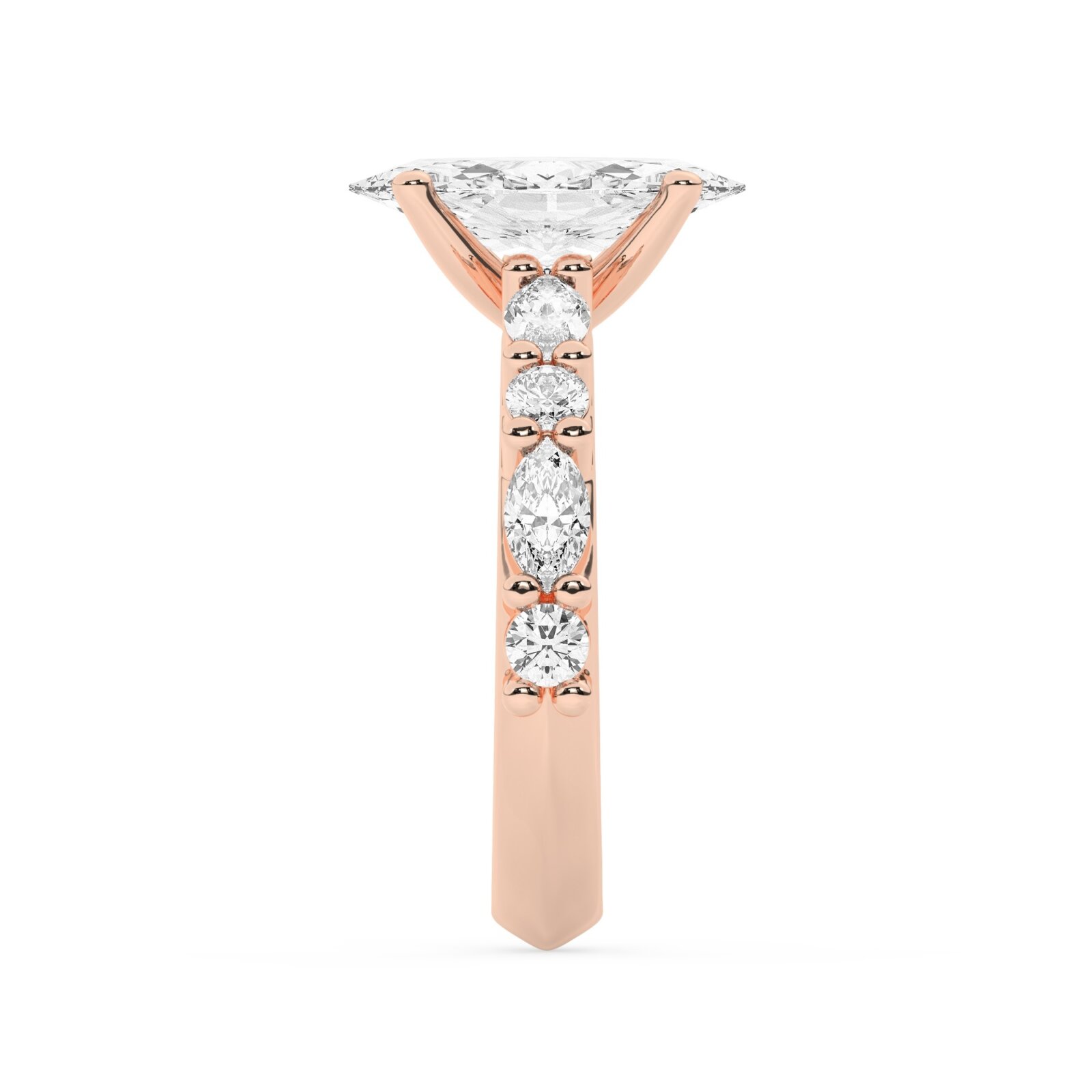 טבעת אירוסין סוליטר ויהלומים בצדדים דגם 50068 כסף מצופה זהב אדום רוזגולד במרכז יהלום מעבדה 2.50 קראט בחיתוך מרקיזה עם תעודה גמולוגית אירופאית IGI מסביב ובצדדים יהלומי מעבדה במשקל של 0.40 קראט בנוסף 0.20 קראט
