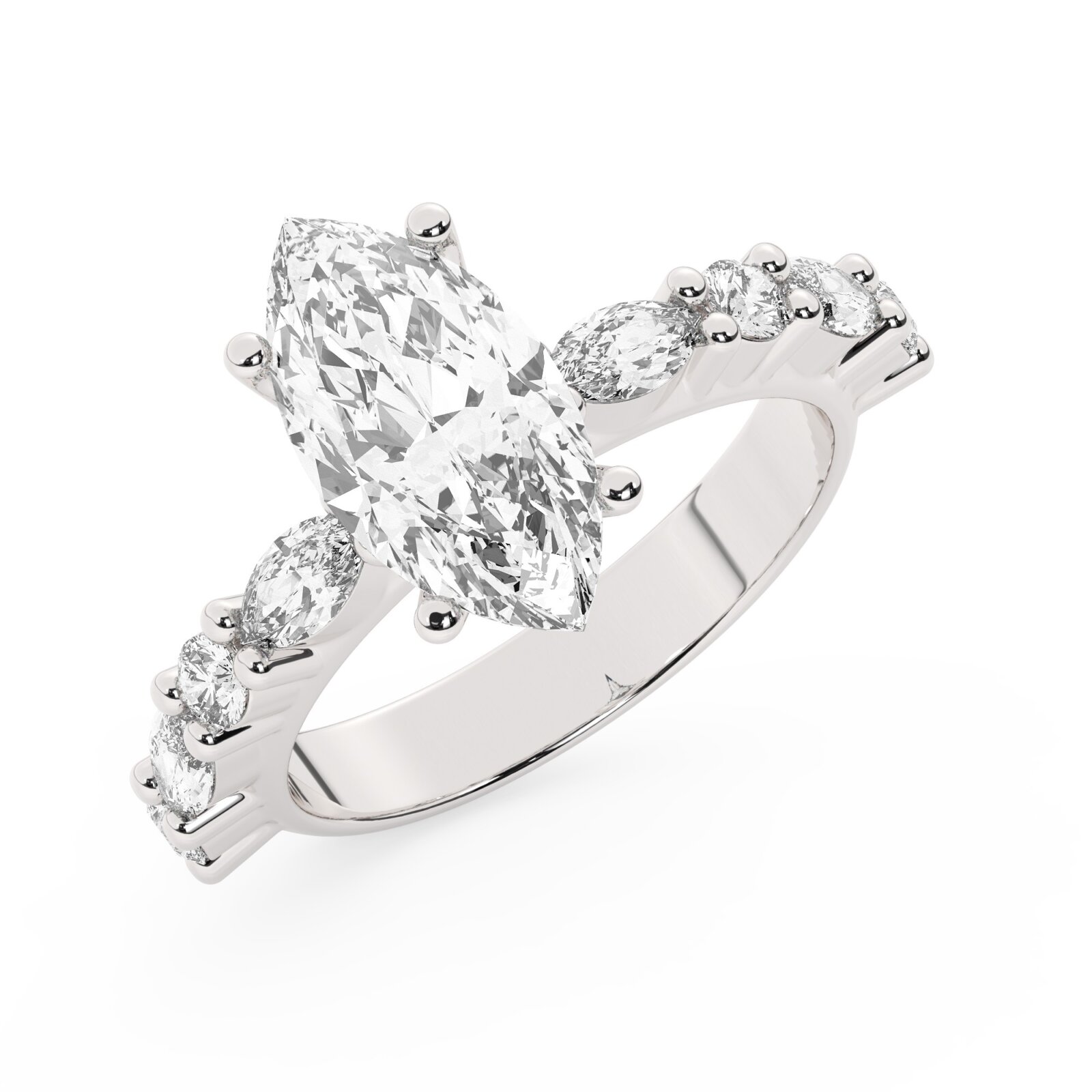 טבעת אירוסין סוליטר ויהלומים בצדדים דגם 50068 כסף מצופה זהב לבן במרכז יהלום מעבדה 3 קראט בחיתוך מרקיזה עם תעודה גמולוגית אירופאית IGI מסביב ובצדדים יהלומי מעבדה במשקל של 0.40 קראט בנוסף 0.20 קראט