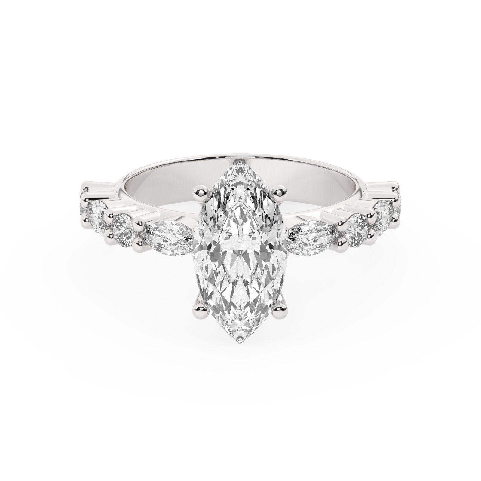 טבעת אירוסין סוליטר ויהלומים בצדדים דגם 50068 כסף מצופה זהב לבן במרכז אבן מעבדה מוסונייט 4 קראט בחיתוך מרקיזה עם תעודה גמולוגית בינלאומית GRA מסביב ובצדדים אבני מעבדה מוסונייט במשקל של 0.40 קראט בנוסף 0.20 קראט