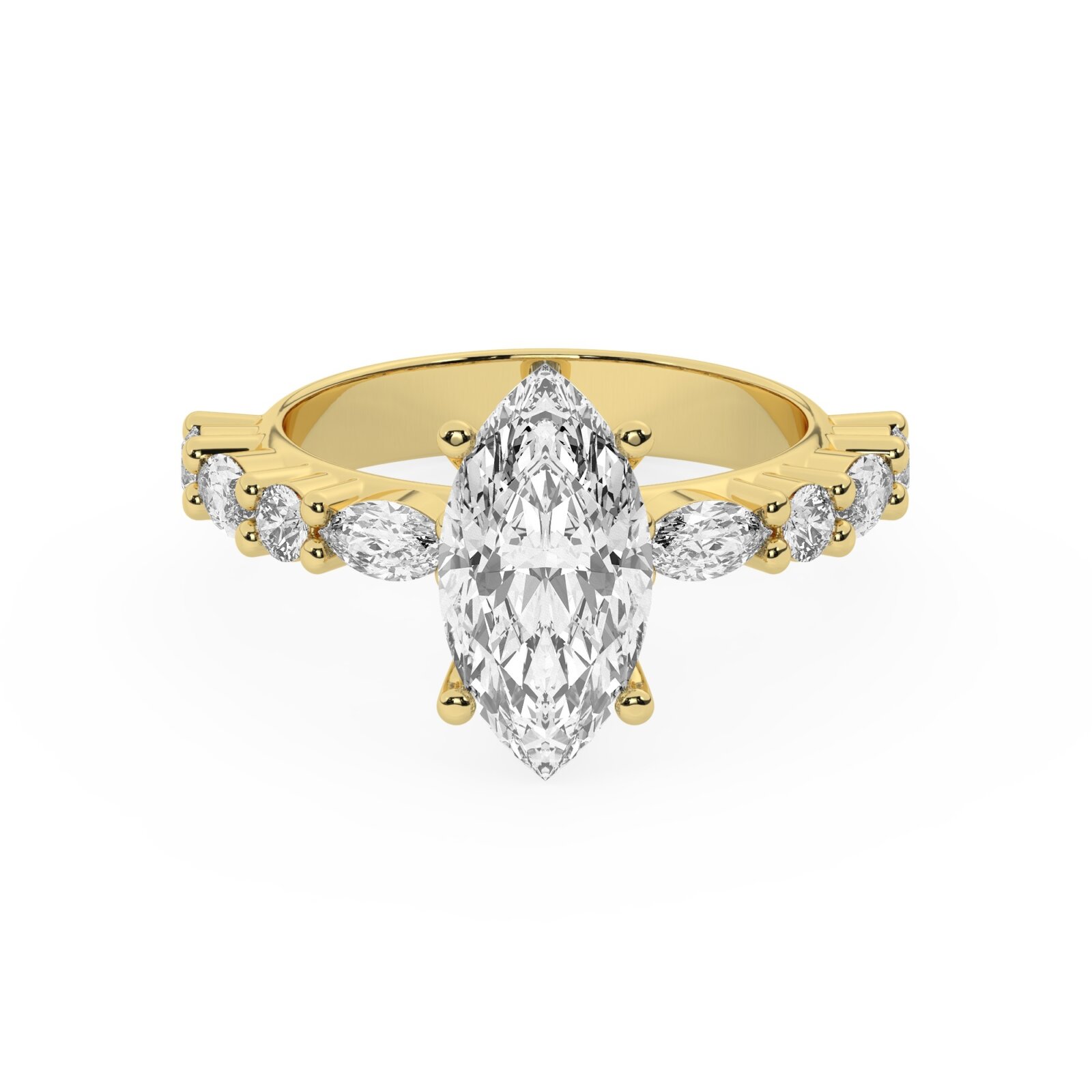 טבעת אירוסין סוליטר ויהלומים בצדדים דגם 50068 כסף מצופה זהב צהוב במרכז אבן מעבדה מוסונייט 4 קראט בחיתוך מרקיזה עם תעודה גמולוגית בינלאומית GRA מסביב ובצדדים אבני מעבדה מוסונייט במשקל של 0.40 קראט בנוסף 0.20 קראט