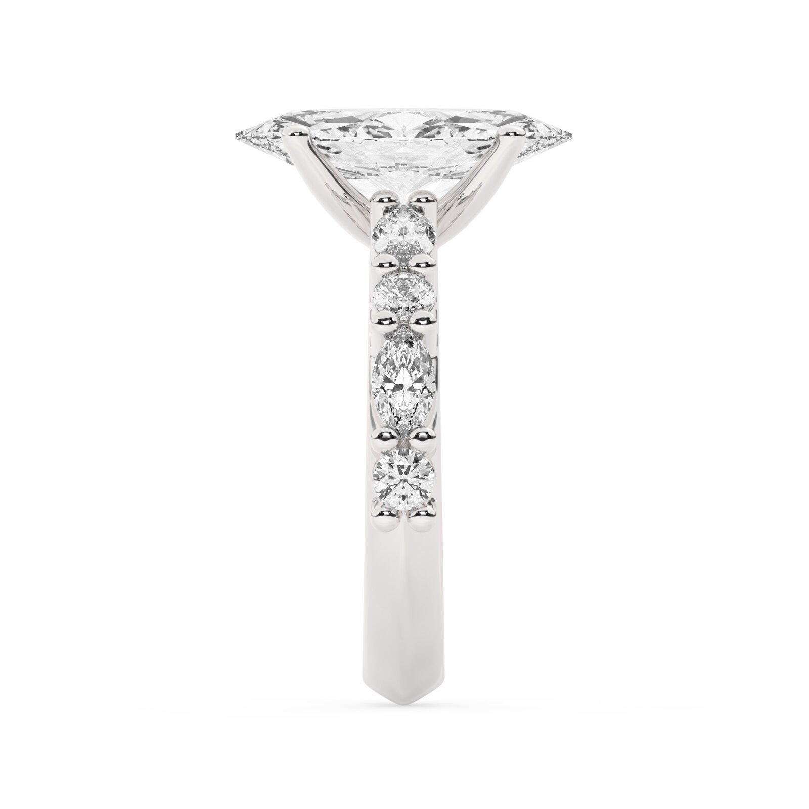 טבעת אירוסין סוליטר ויהלומים בצדדים דגם 50068 כסף מצופה זהב לבן במרכז אבן מעבדה מוסונייט 5 קראט בחיתוך מרקיזה עם תעודה גמולוגית בינלאומית GRA מסביב ובצדדים אבני מעבדה מוסונייט במשקל של 0.40 קראט בנוסף 0.20 קראט