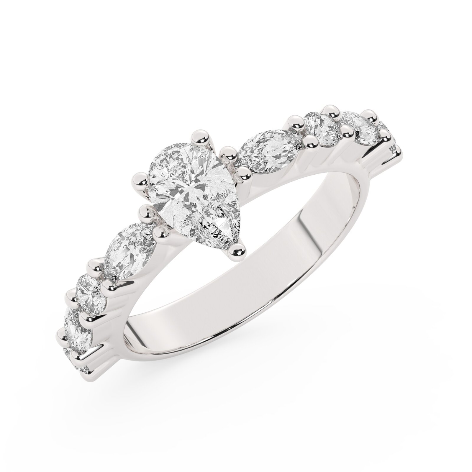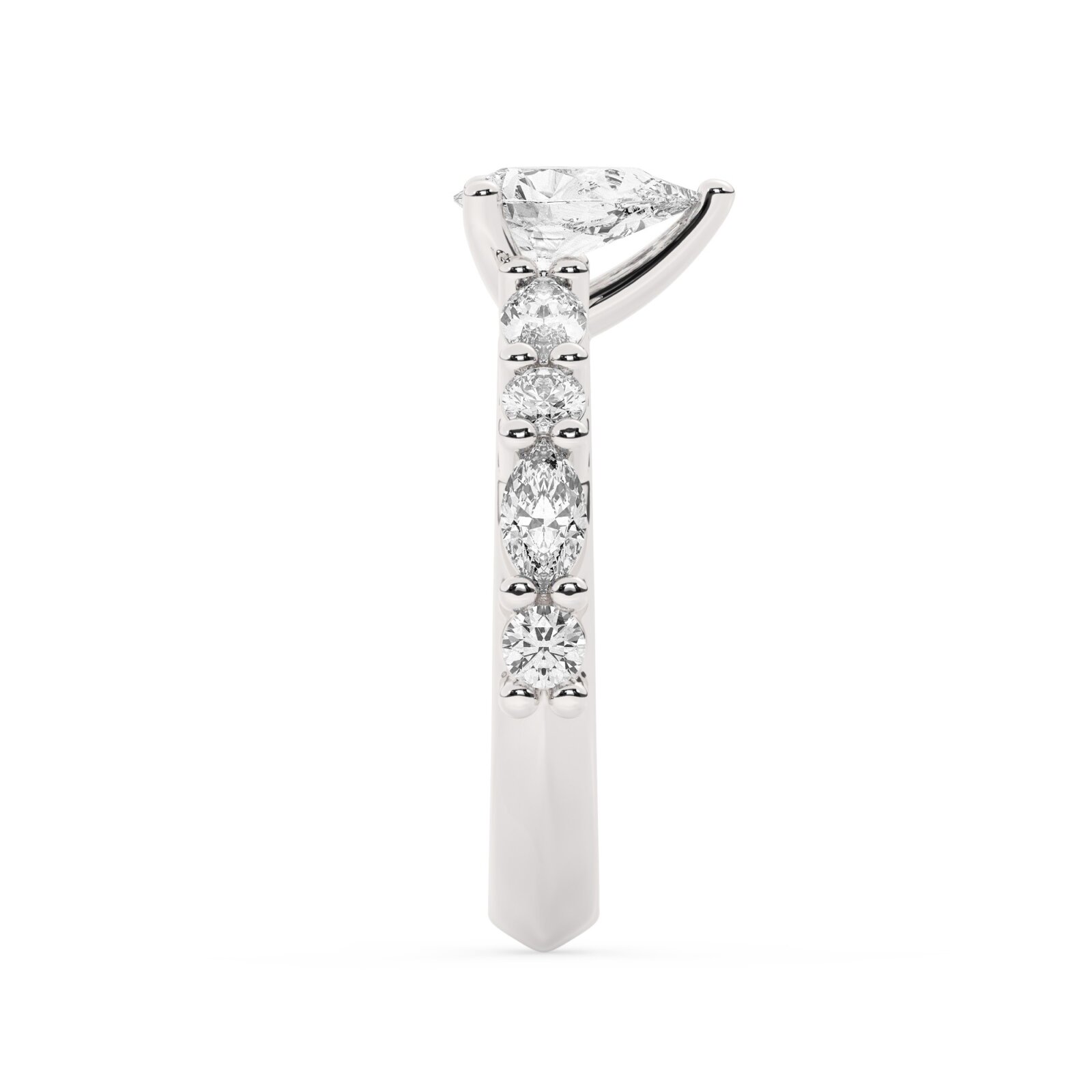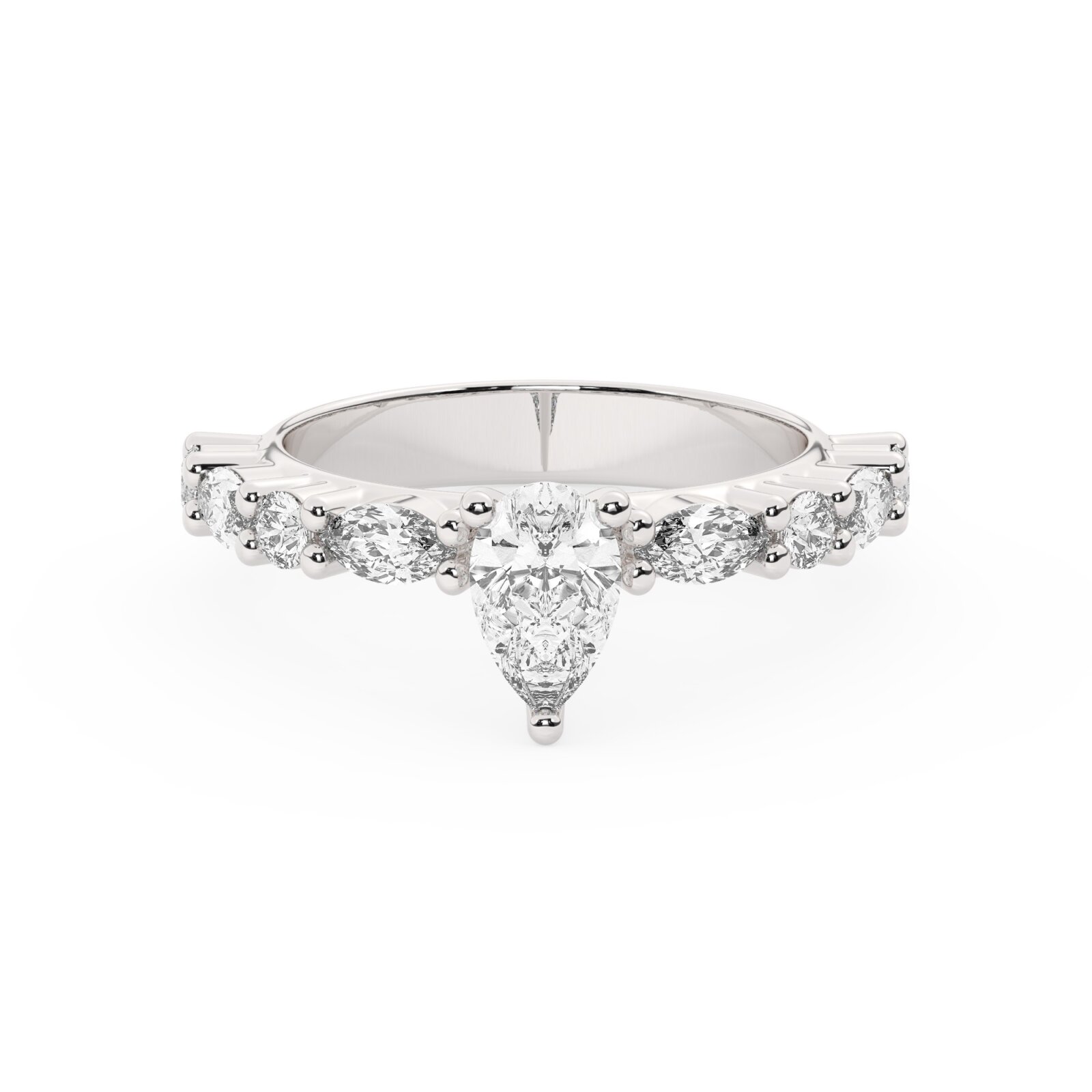 טבעת אירוסין סוליטר ויהלומים בצדדים דגם 50068 כסף מצופה זהב לבן במרכז אבן מעבדה מוסונייט 3 קראט בחיתוך טיפה עם תעודה גמולוגית בינלאומית GRA מסביב ובצדדים אבני מעבדה מוסונייט במשקל של 0.40 קראט בנוסף 0.20 קראט