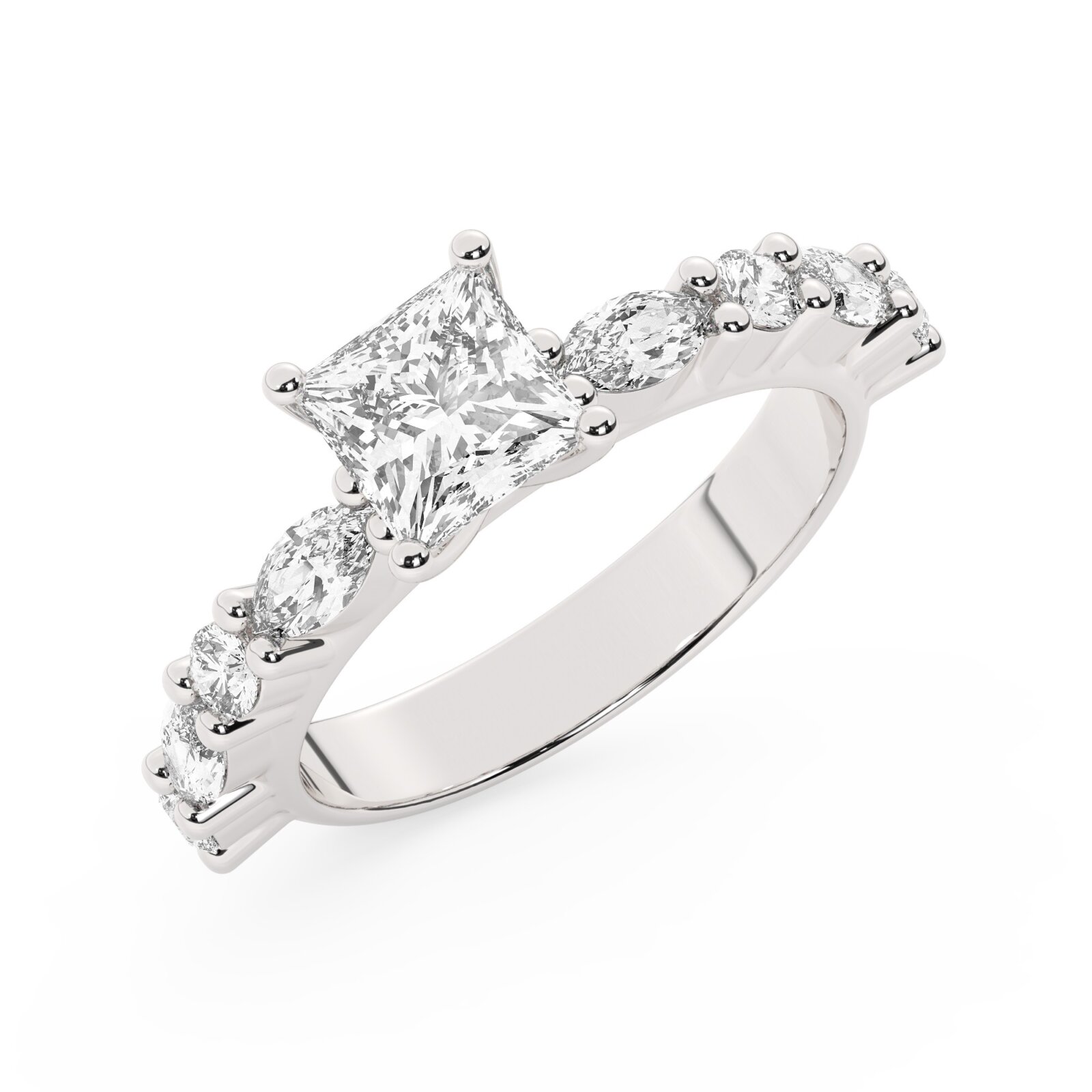טבעת אירוסין סוליטר ויהלומים בצדדים דגם 50068 כסף מצופה זהב לבן במרכז יהלום מעבדה 2.50 קראט בחיתוך פרינסס עם תעודה גמולוגית אירופאית IGI מסביב ובצדדים יהלומי מעבדה במשקל של 0.40 קראט בנוסף 0.20 קראט