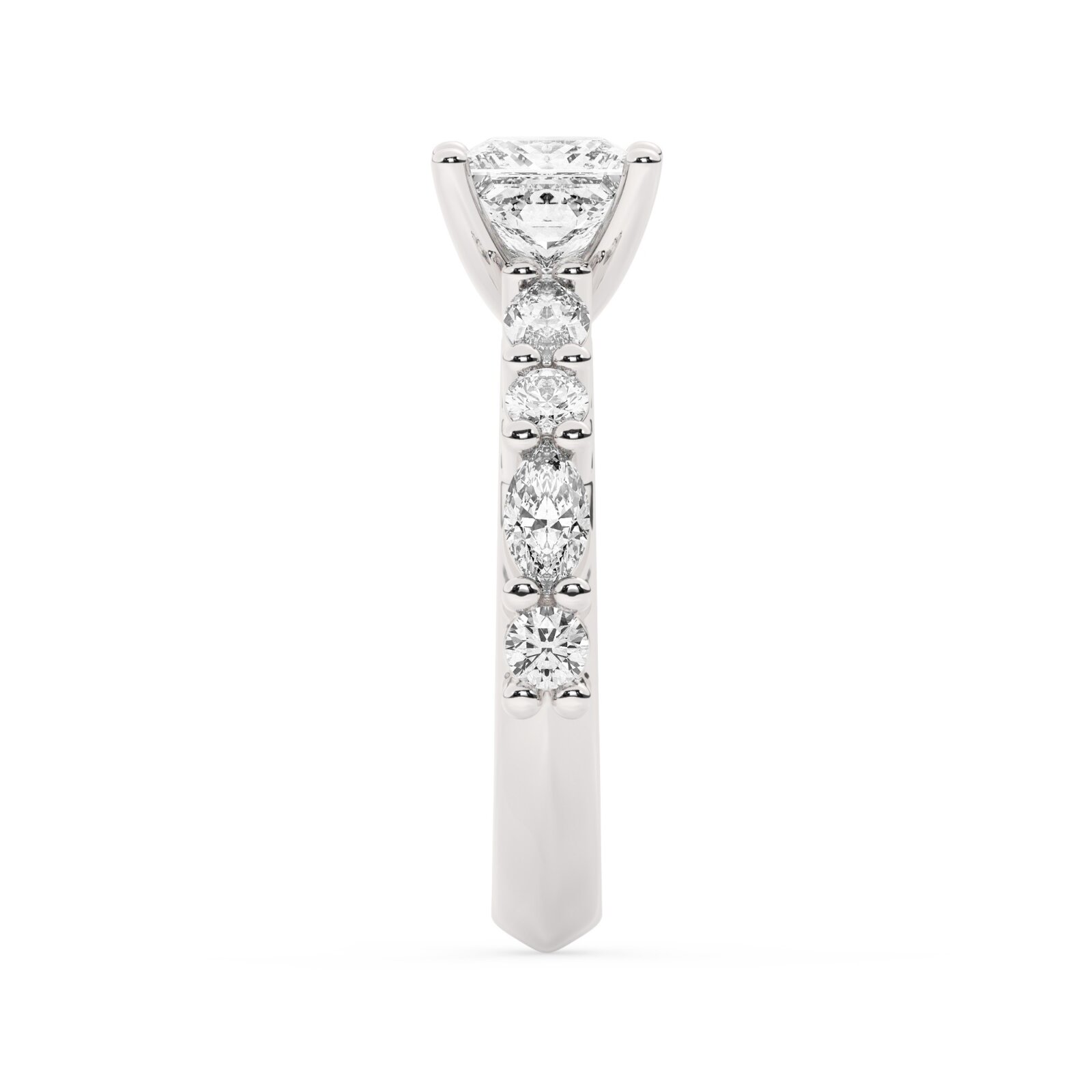 טבעת אירוסין סוליטר ויהלומים בצדדים דגם 50068 כסף מצופה זהב לבן במרכז אבן מעבדה מוסונייט 3 קראט בחיתוך פרינסס עם תעודה גמולוגית בינלאומית GRA מסביב ובצדדים אבני מעבדה מוסונייט במשקל של 0.40 קראט בנוסף 0.20 קראט