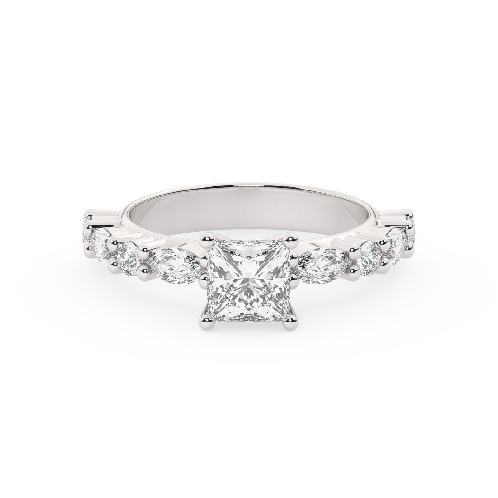 50% הנחהטבעת אירוסין דגם מירב זהב לבן 14 קראט יהלום מעבדה בחיתוך פרינסס 0.50 קראט ובצדדים שני יהלומים בחיתוך טיפה עם תעודה גמולוגית אירופאית IGI