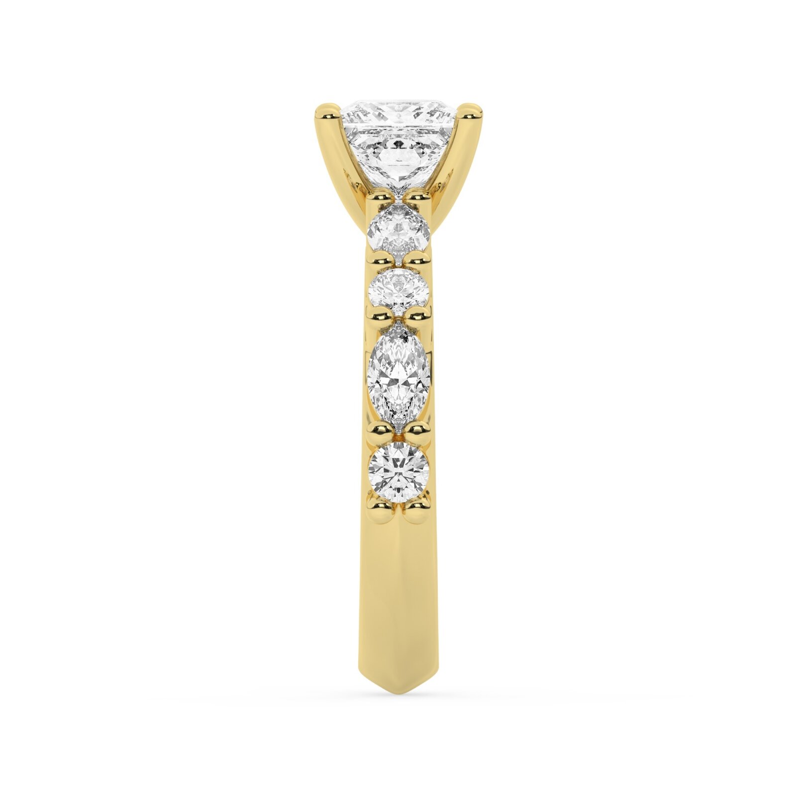 טבעת אירוסין סוליטר ויהלומים בצדדים דגם 50068 כסף מצופה זהב צהוב במרכז אבן מעבדה מוסונייט 3 קראט בחיתוך פרינסס עם תעודה גמולוגית בינלאומית GRA מסביב ובצדדים אבני מעבדה מוסונייט במשקל של 0.40 קראט בנוסף 0.20 קראט