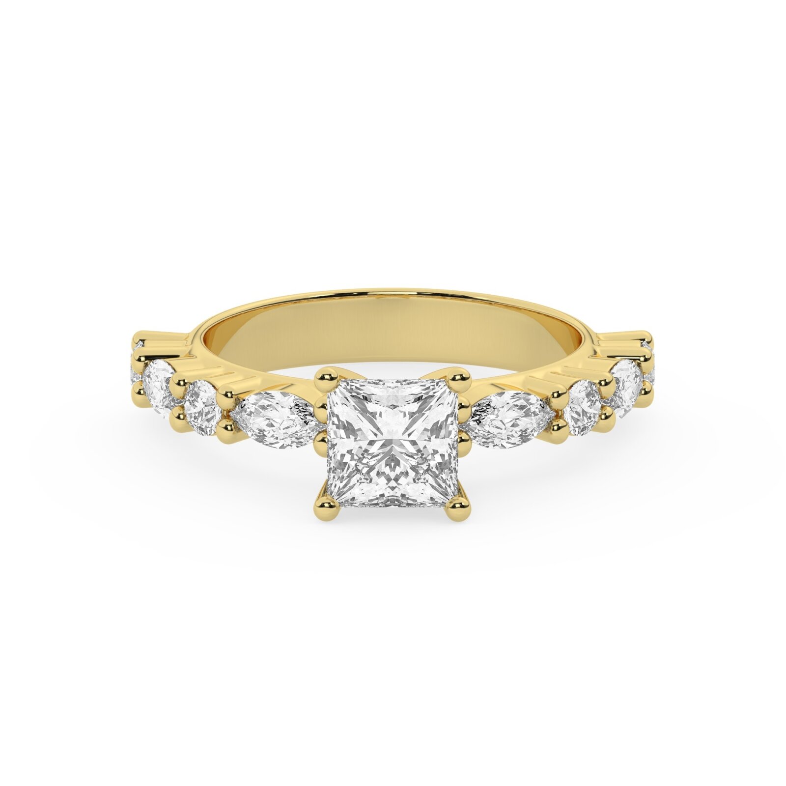 טבעת אירוסין סוליטר ויהלומים בצדדים דגם 50068 כסף מצופה זהב צהוב במרכז יהלום מעבדה 4 קראט בחיתוך פרינסס עם תעודה גמולוגית אירופאית IGI מסביב ובצדדים יהלומי מעבדה במשקל של 0.40 קראט בנוסף 0.20 קראט