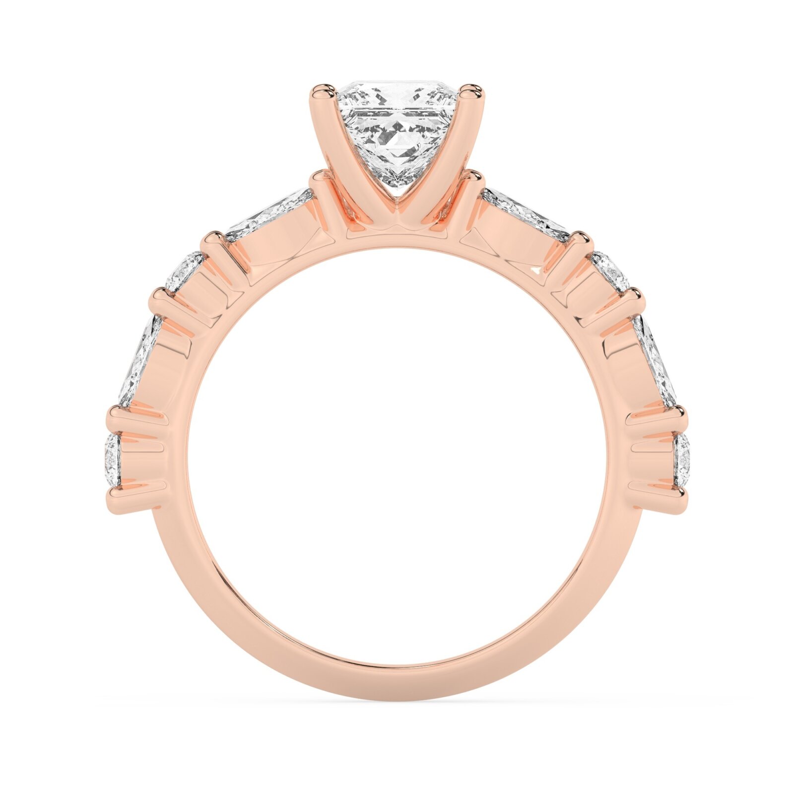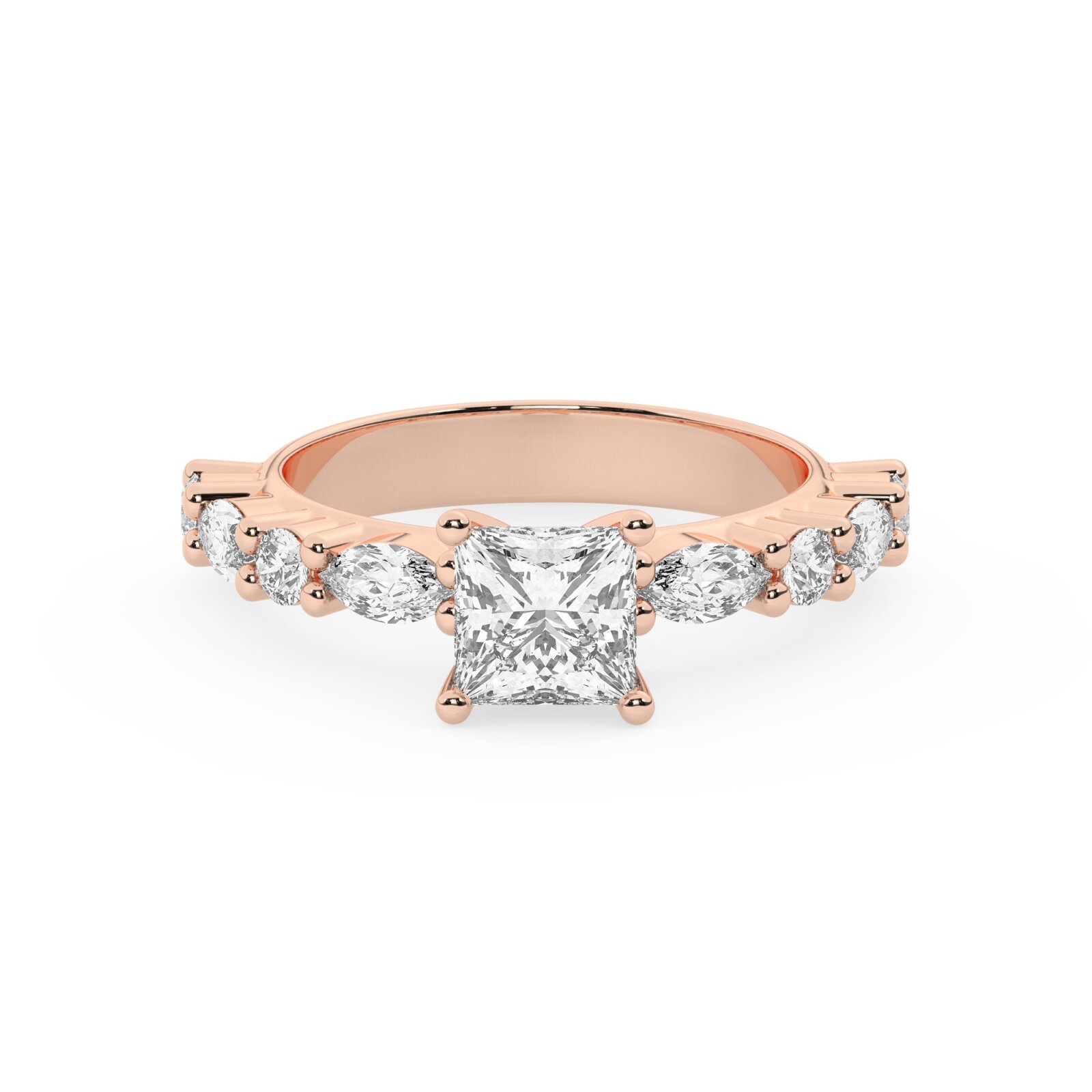 טבעת אירוסין סוליטר ויהלומים בצדדים דגם 50068 כסף מצופה זהב אדום רוזגולד במרכז יהלום מעבדה 4 קראט בחיתוך פרינסס עם תעודה גמולוגית אירופאית IGI מסביב ובצדדים יהלומי מעבדה במשקל של 0.40 קראט בנוסף 0.20 קראט