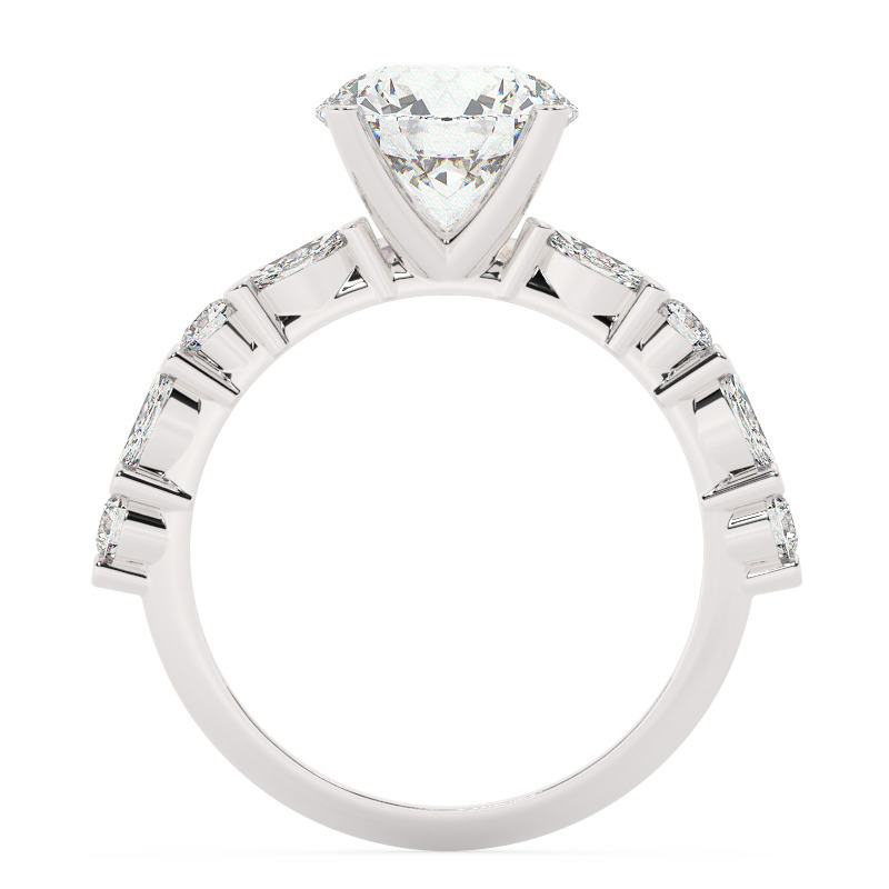 עם משקל כולל של 4.60 קראט, האבן המרכזית מושכת את תשומת הלב עם כמות מרשימה של 4 קראט. תעודה גמולוגית נוספת היא הוכחה לרמת האיכות הגבוהה של האבן. צבע האבן D ושקיפות VVS1 מבטיחים שהטבעת תבריק ותשקף אור בצורה מדהימה. הבהירות והזוהר של האבן המרכזית מלוות באבנים צדדיות – ארבע אבני זירקוניה מרקיזה בכל צד, במשקל של 0.40 קראט כל אחת, וכן ארבע אבנים עגולות בגודל 0.20 קראט. כל אחד מהאבנים הללו מעוצבות בצורה מדויקת כך שיחד הם יוצרים הרמוניה מושלמת של ניגודים.