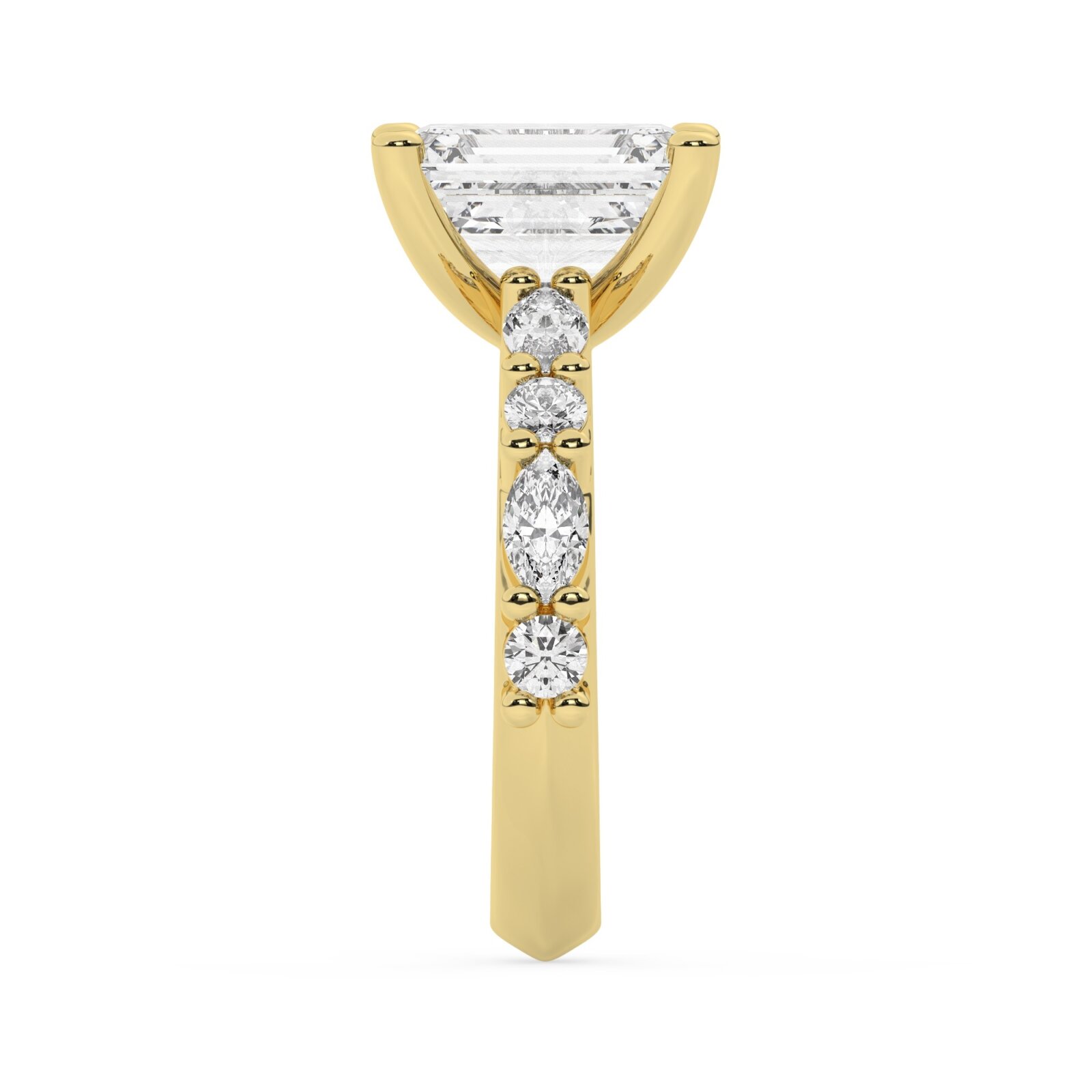 טבעת אירוסין סוליטר ויהלומים בצדדים דגם 50068 זהב צהוב 14 קראט במרכז אבן מעבדה מוסונייט 3 קראט בחיתוך אמרלד עם תעודה גמולוגית בינלאומית GRA מסביב ובצדדים אבני מעבדה מוסונייט במשקל של 0.40 קראט בנוסף 0.20 קראט