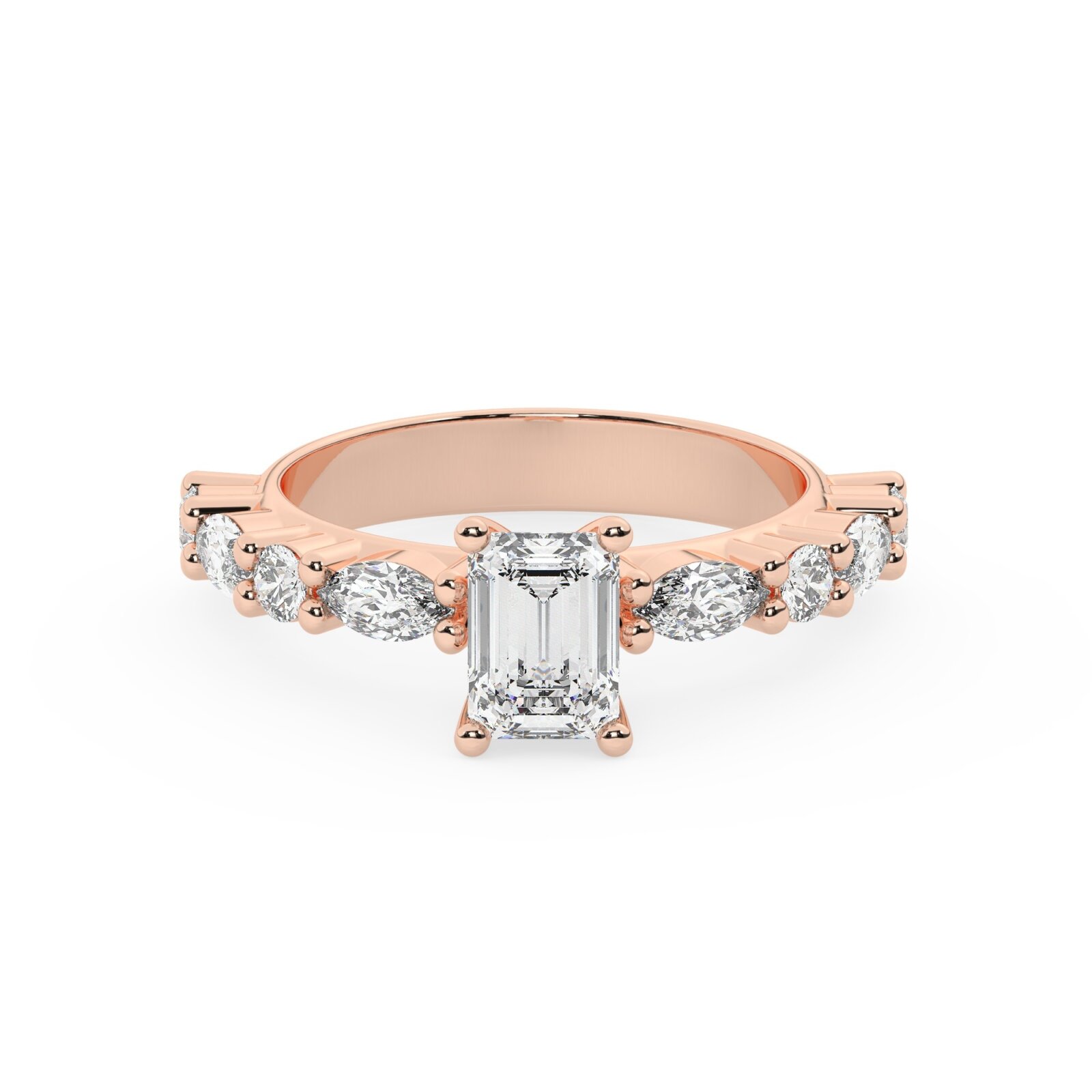 טבעת אירוסין סוליטר ויהלומים בצדדים דגם 50068 זהב אדום רוזגולד 14 קראט במרכז אבן מעבדה מוסונייט 0.50 קראט בחיתוך אמרלד עם תעודה גמולוגית מסביב ובצדדים אבני מעבדה מוסונייט במשקל של 0.40 קראט בנוסף 0.20 קראט
