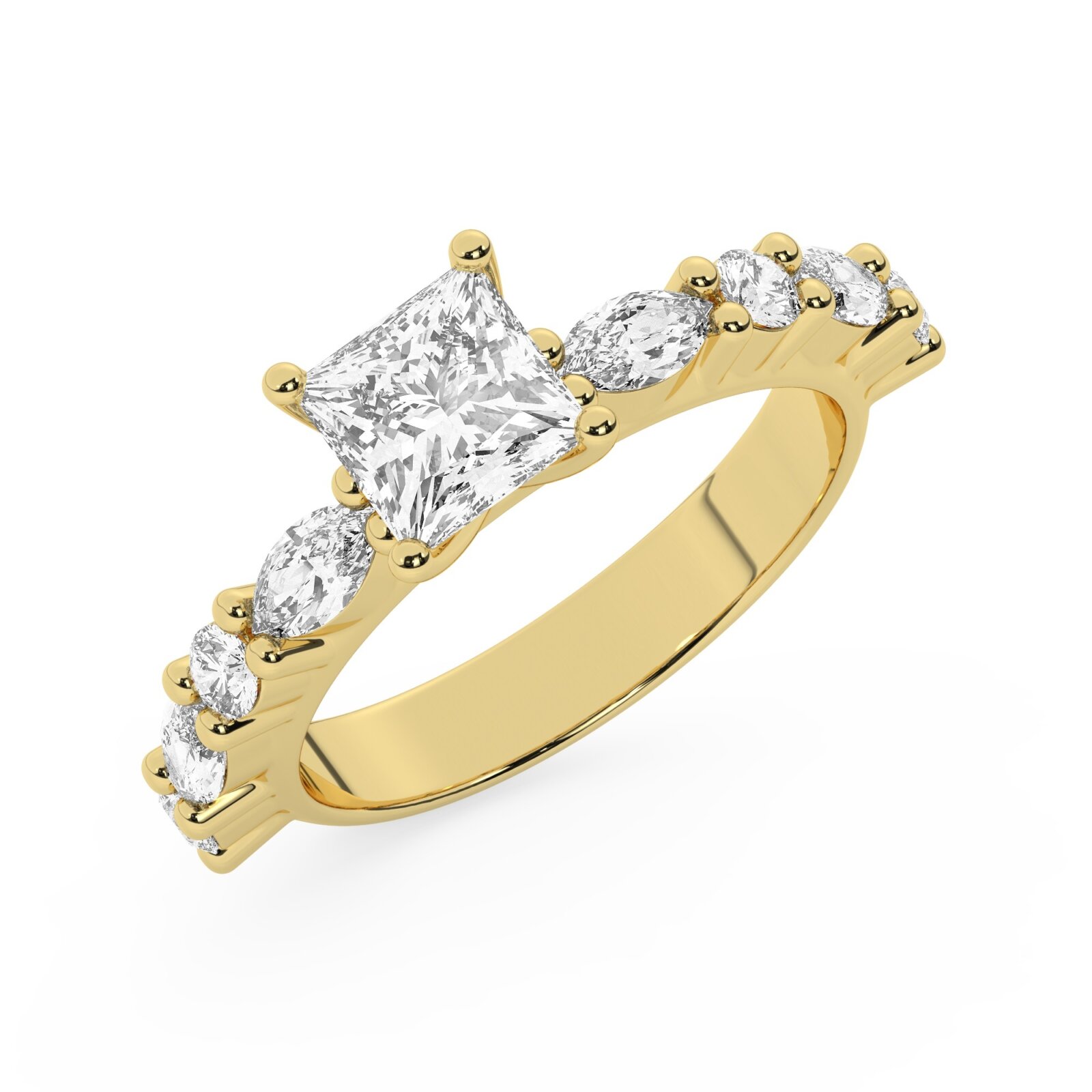 טבעת אירוסין סוליטר ויהלומים בצדדים דגם 50068 זהב צהוב 14 קראט במרכז יהלום מעבדה 0.50 קראט בחיתוך פרינסס עם תעודה גמולוגית מסביב ובצדדים יהלומי מעבדה במשקל של 0.40 קראט בנוסף 0.20 קראט