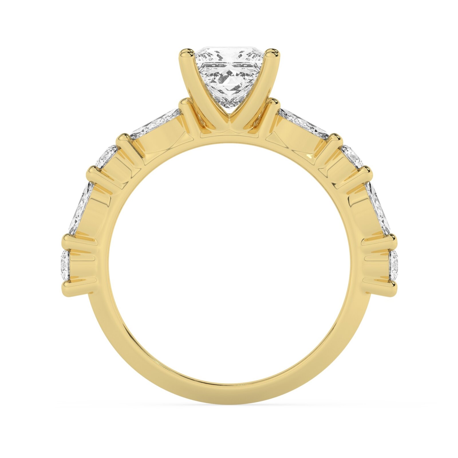 טבעת אירוסין סוליטר ויהלומים בצדדים דגם 50068 זהב צהוב 14 קראט במרכז אבן מעבדה מוסונייט 0.75 קראט בחיתוך פרינסס עם תעודה גמולוגית מסביב ובצדדים אבני מעבדה מוסונייט במשקל של 0.40 קראט בנוסף 0.20 קראט