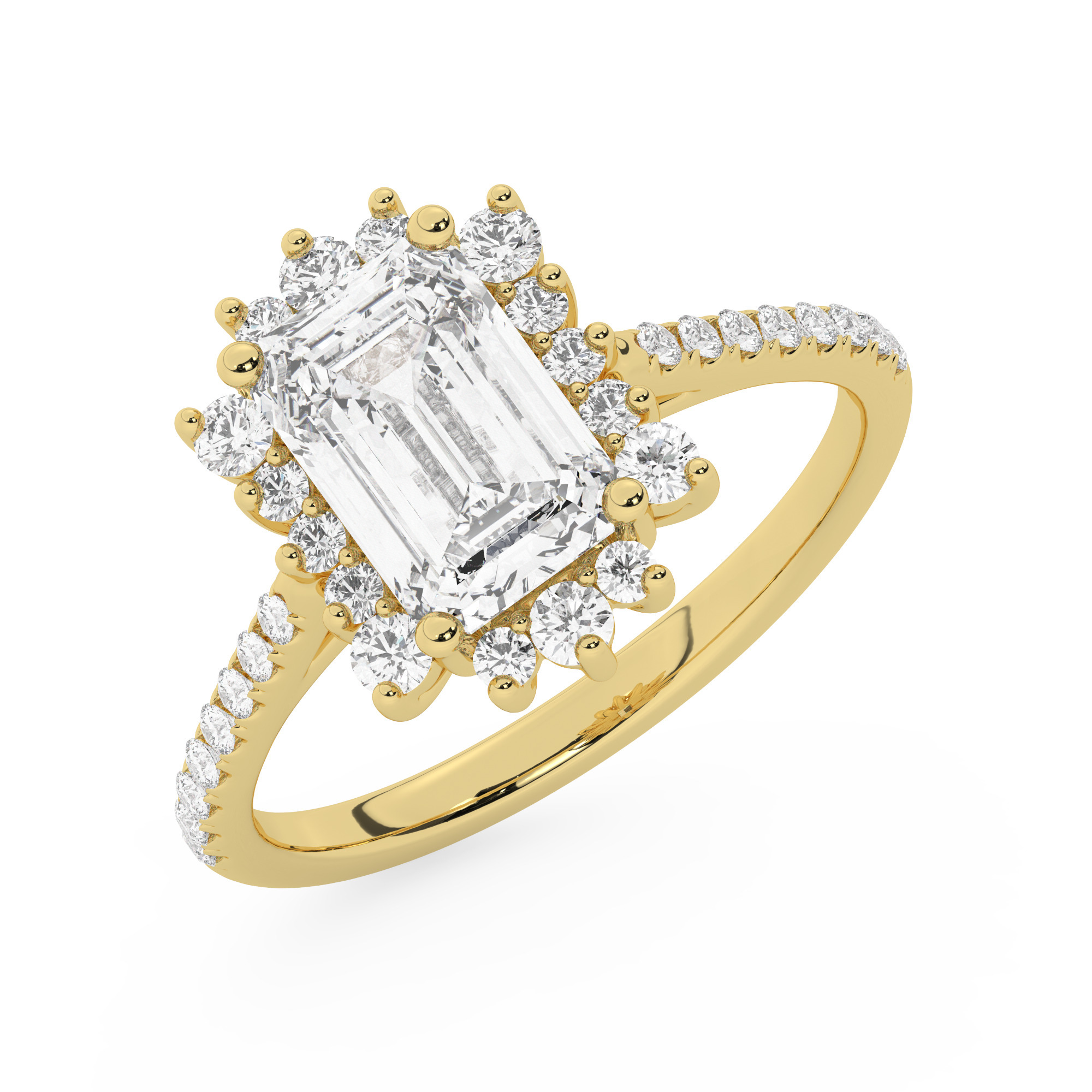 טבעת אירוסין היילו דגם 50024 כסף מצופה זהב צהוב במרכז יהלום מעבדה 0.75 קראט בחיתוך אמרלד עם תעודה גמולוגית מסביב ובצדדים יהלומי מעבדה במשקל כולל של 0.39 קראט בחיתוך עגול