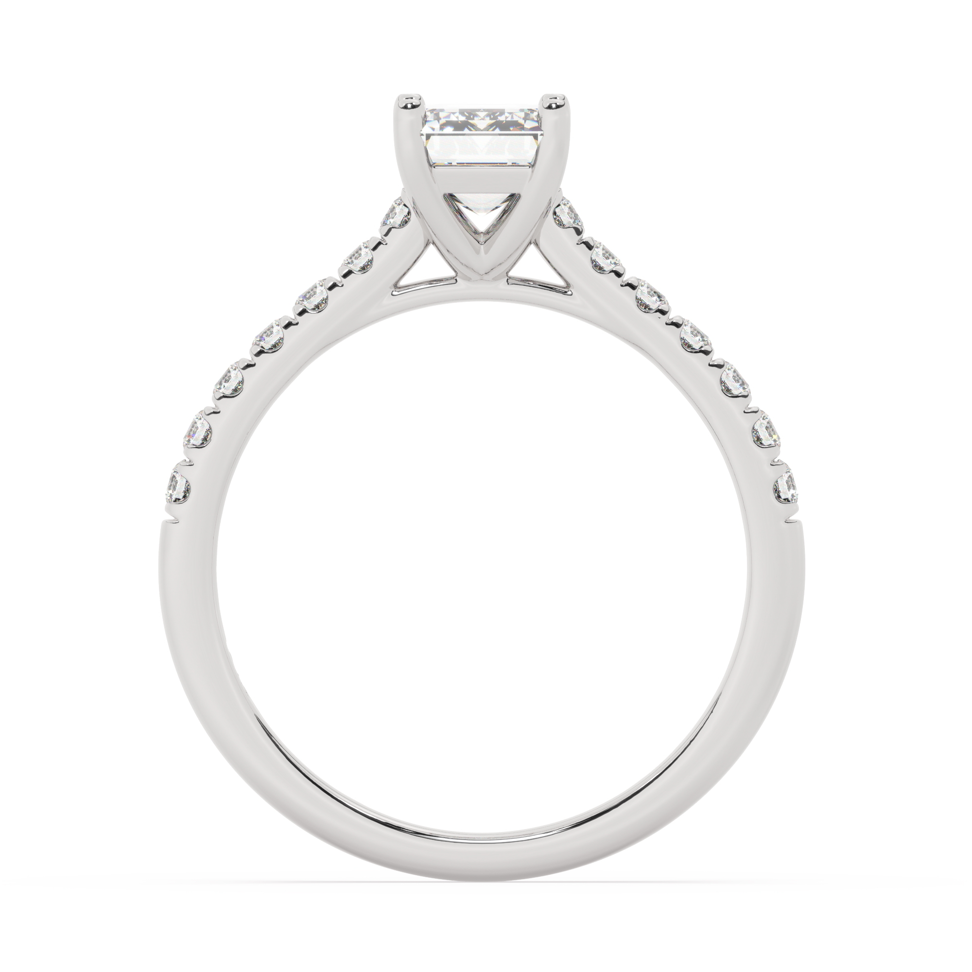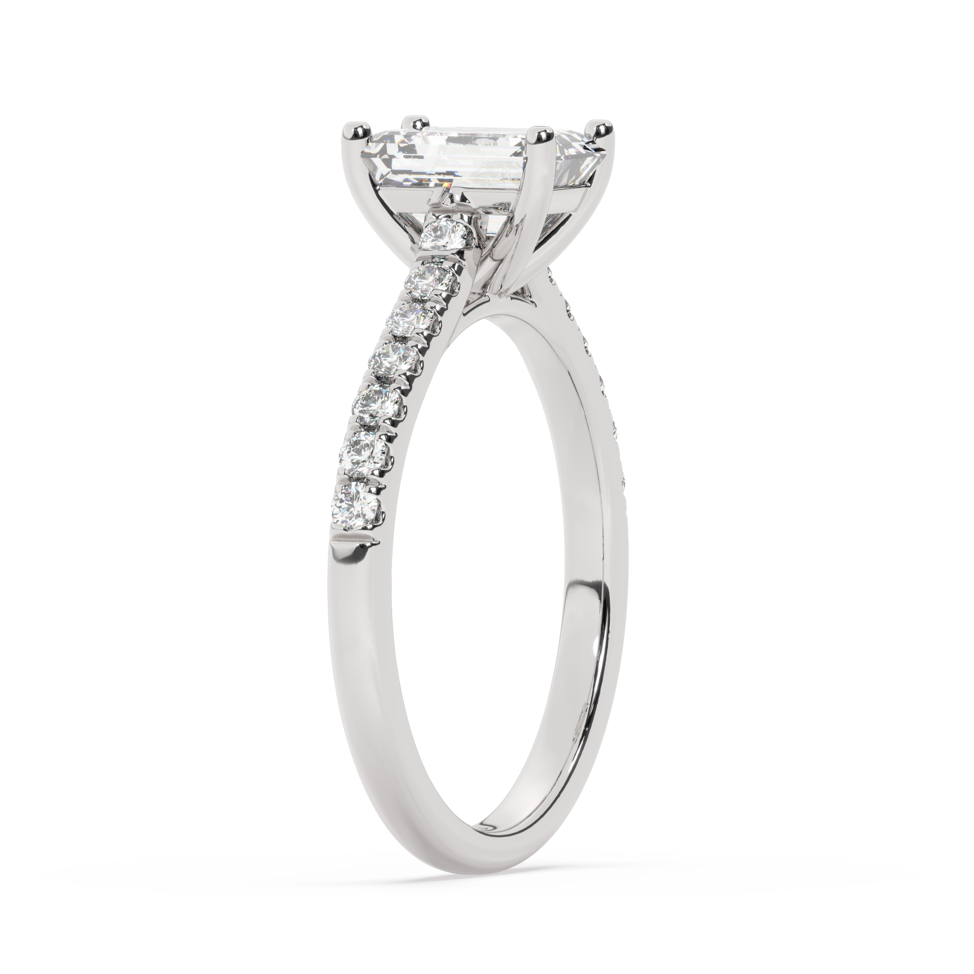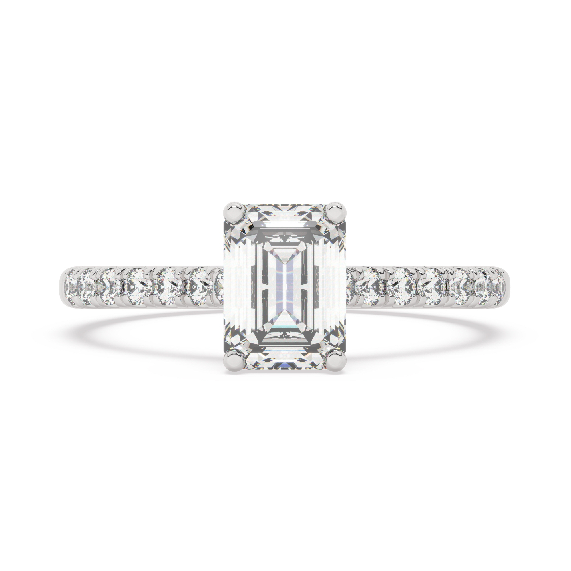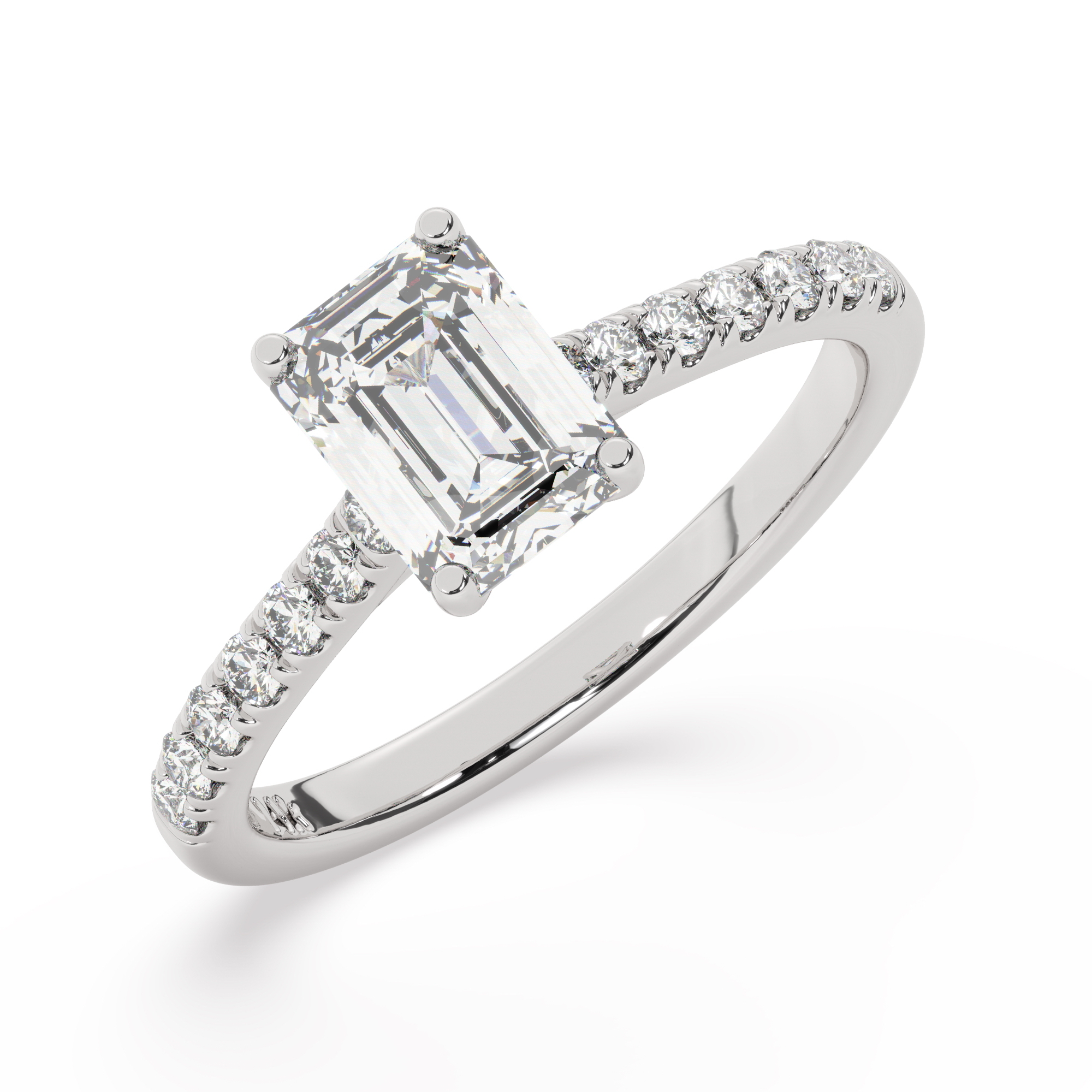 טבעת אירוסין סוליטר ויהלומים בצדדים דגם 50019 כסף מצופה זהב לבן במרכז יהלום מעבדה 1 קראט בחיתוך אמרלד עם תעודה גמולוגית אירופאית IGI מסביב ובצדדים יהלומי מעבדה במשקל כולל של 0.28 קראט בחיתוך עגול