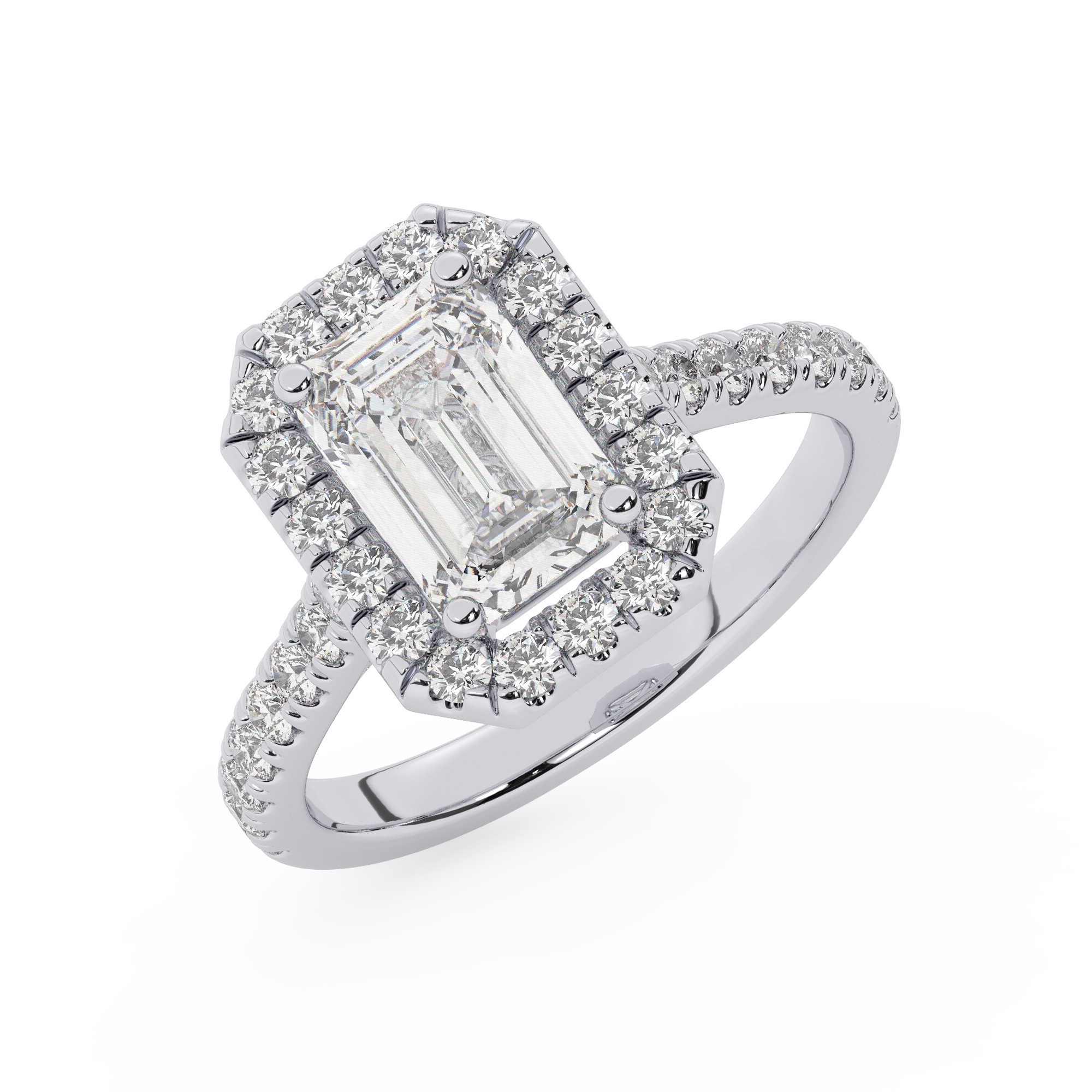 טבעת אירוסין היילו דגם 50026 כסף מצופה זהב לבן במרכז יהלום מעבדה 3 קראט בחיתוך אמרלד עם תעודה גמולוגית אירופאית IGI מסביב ובצדדים יהלומי מעבדה במשקל כולל של 0.72 קראט בחיתוך עגול