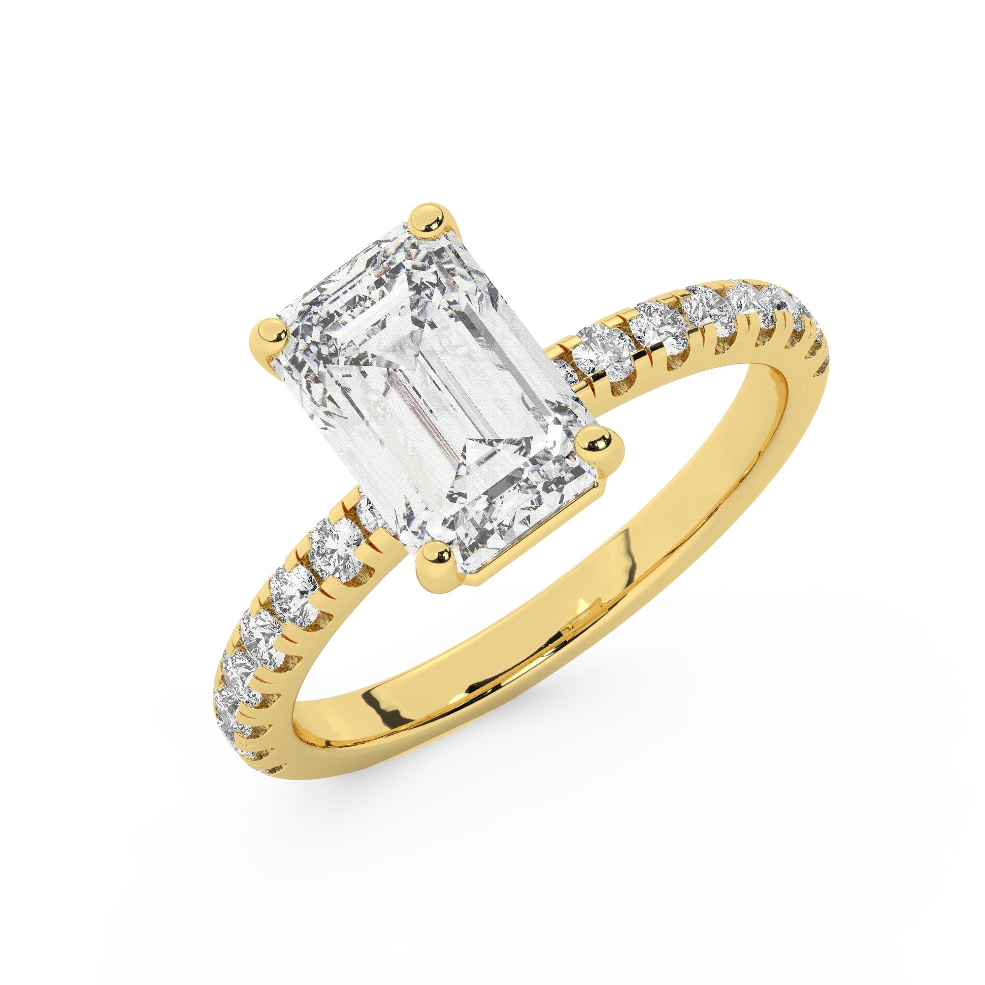 טבעת אירוסין סוליטר ויהלומים בצדדים דגם 50037 כסף מצופה זהב צהוב במרכז יהלום מעבדה 3 קראט בחיתוך אמרלד עם תעודה גמולוגית אירופאית IGI מסביב ובצדדים יהלומי מעבדה במשקל כולל של 0.32 קראט בחיתוך עגול