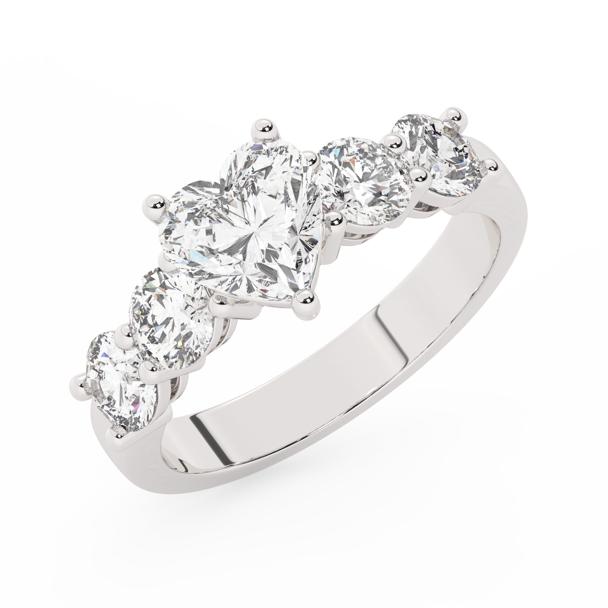טבעת אירוסין סוליטר ויהלומים בצדדים דגם 50030 כסף מצופה זהב לבן במרכז יהלום מעבדה 0.75 קראט בחיתוך לב עם תעודה גמולוגית מסביב ובצדדים יהלומי מעבדה במשקל כולל של 1.08 קראט בחיתוך עגול