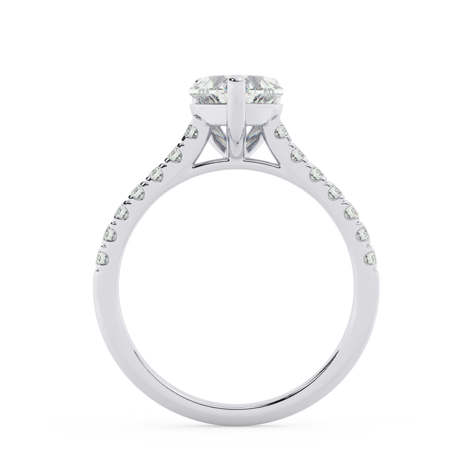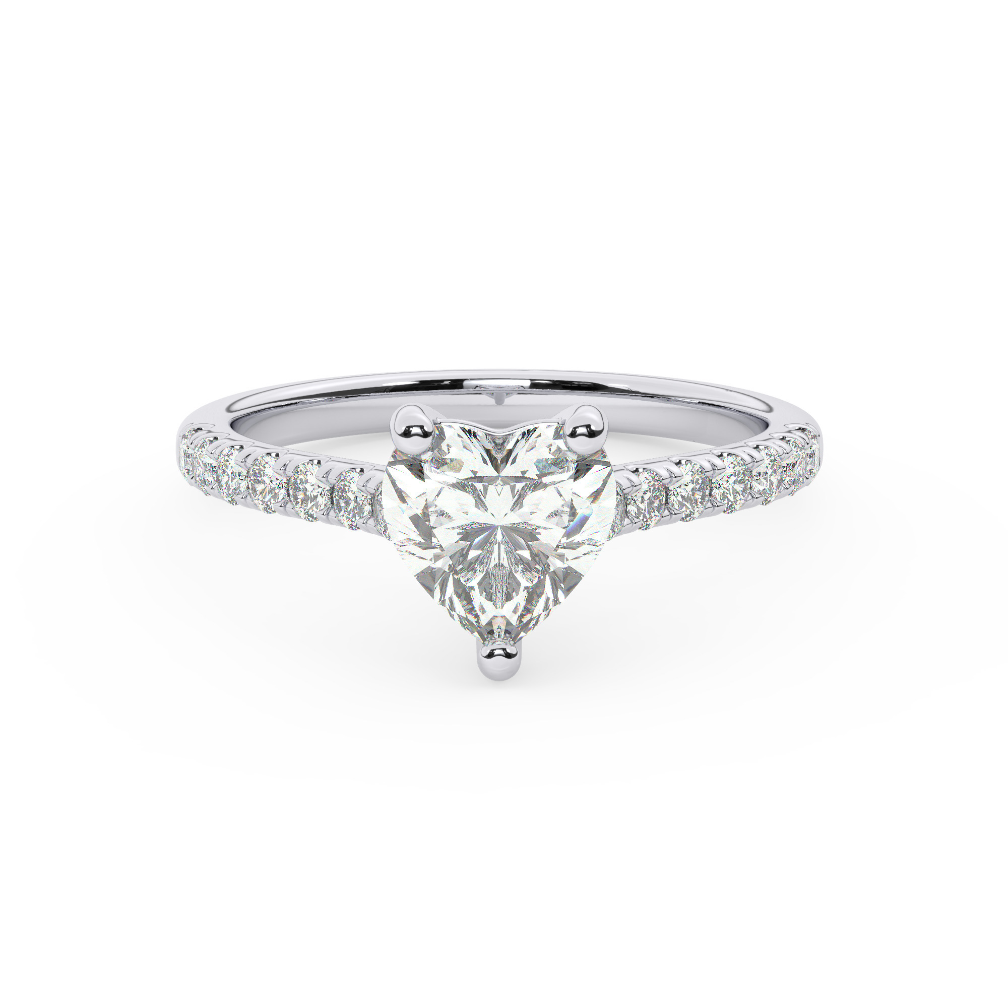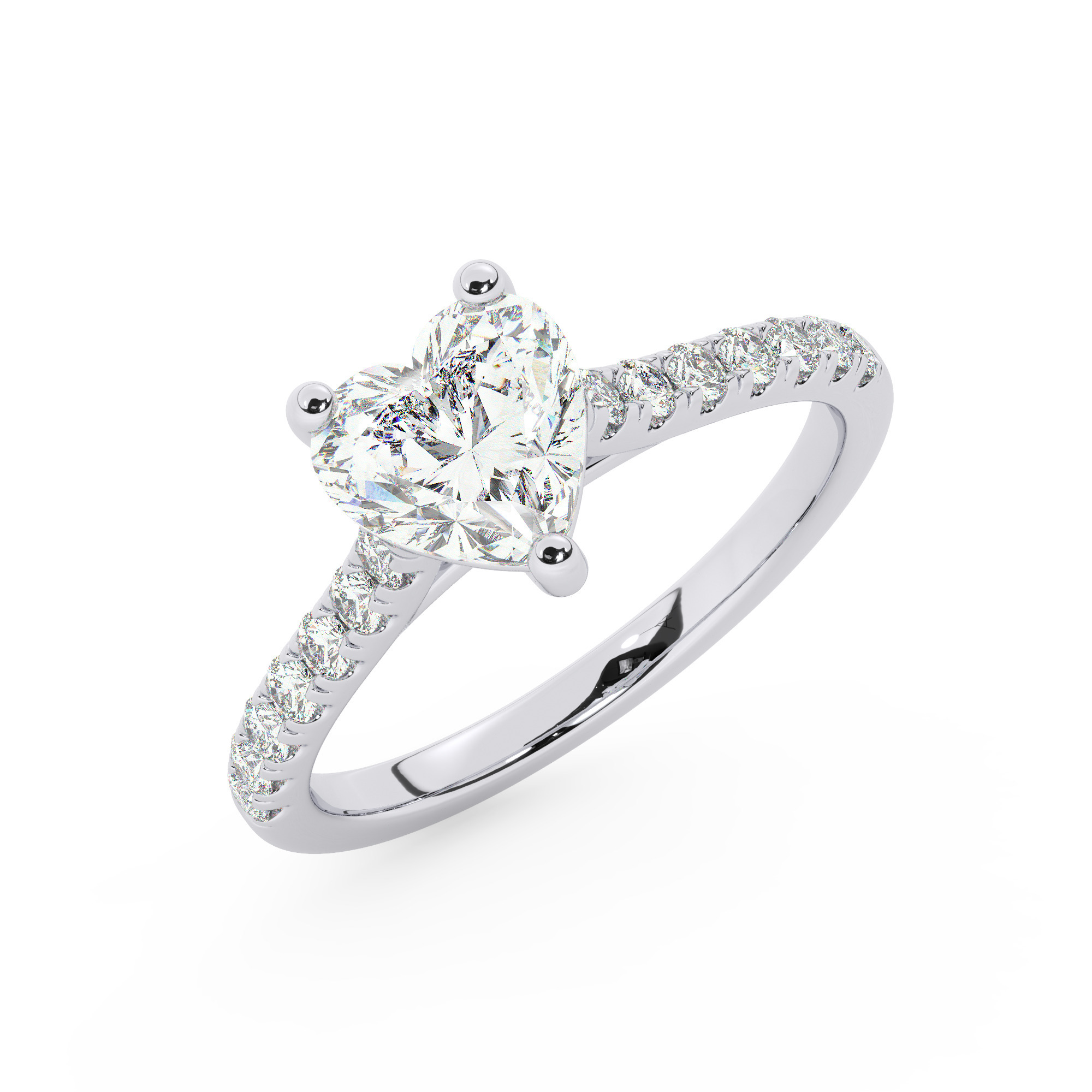 טבעת אירוסין סוליטר ויהלומים בצדדים דגם 50019 כסף מצופה זהב לבן במרכז יהלום מעבדה 1 קראט בחיתוך לב עם תעודה גמולוגית אירופאית IGI מסביב ובצדדים יהלומי מעבדה במשקל כולל של 0.28 קראט בחיתוך עגול