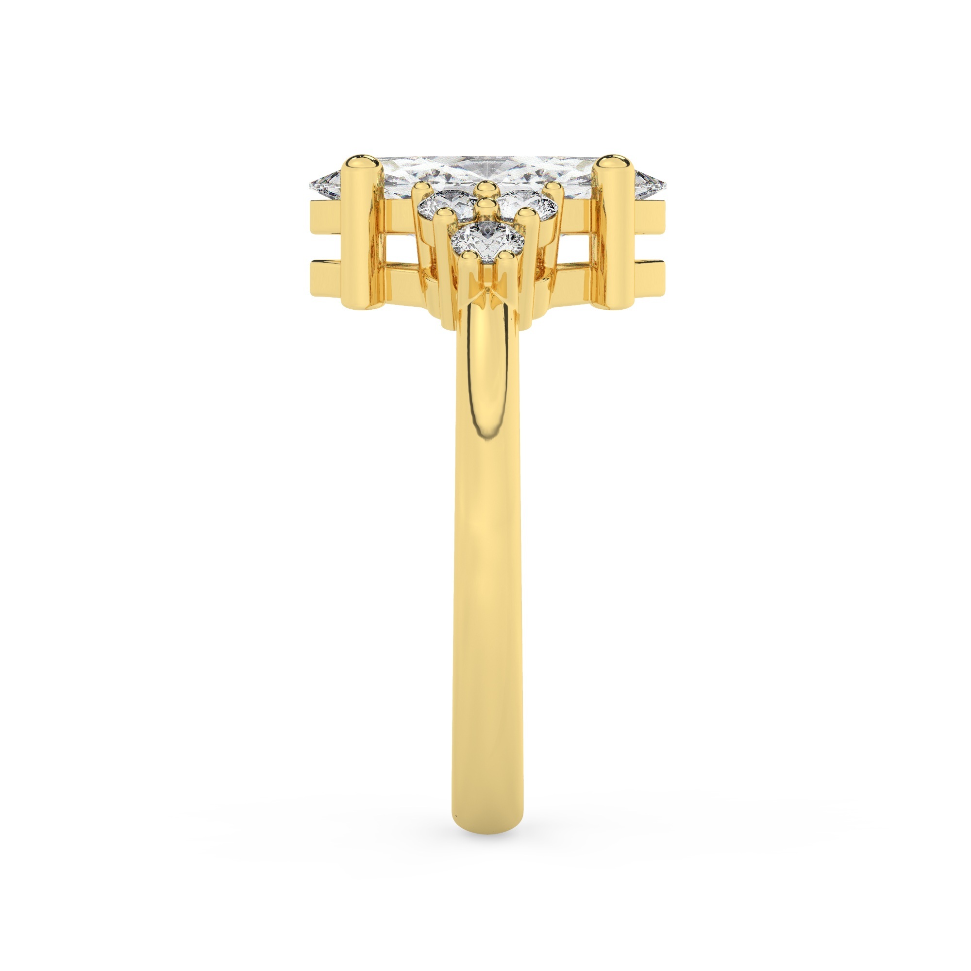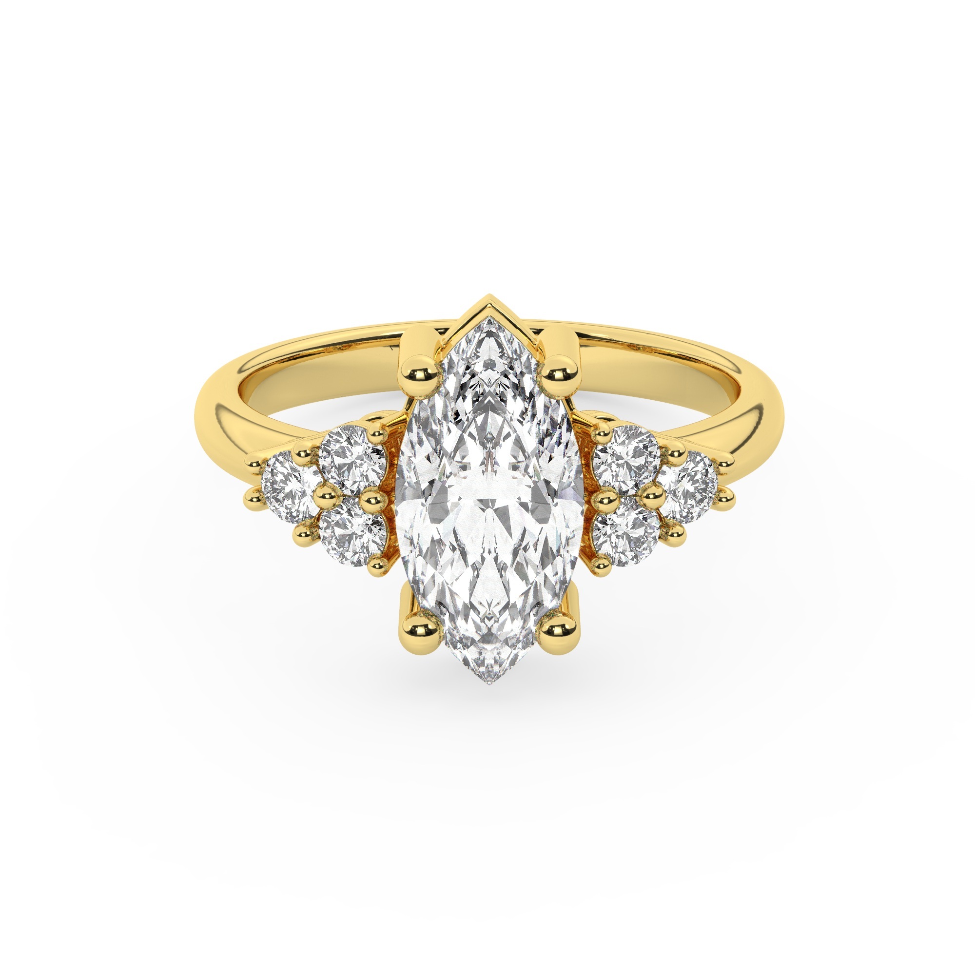 טבעת אירוסין סוליטר ויהלומים בצדדים דגם 50041 כסף מצופה זהב צהוב במרכז יהלום מעבדה 1 קראט בחיתוך מרקיזה עם תעודה גמולוגית אירופאית IGI מסביב ובצדדים יהלומי מעבדה במשקל כולל של 0.30 קראט בחיתוך עגול
