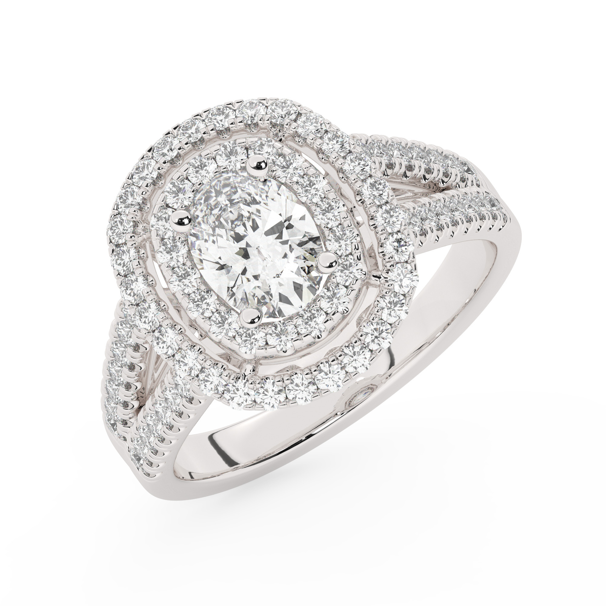 טבעת אירוסין היילו דגם 50025 זהב לבן 14 קראט במרכז יהלום מעבדה 0.75 קראט בחיתוך אובל עם תעודה גמולוגית מסביב ובצדדים יהלומי מעבדה במשקל כולל של 0.62 קראט בחיתוך עגול