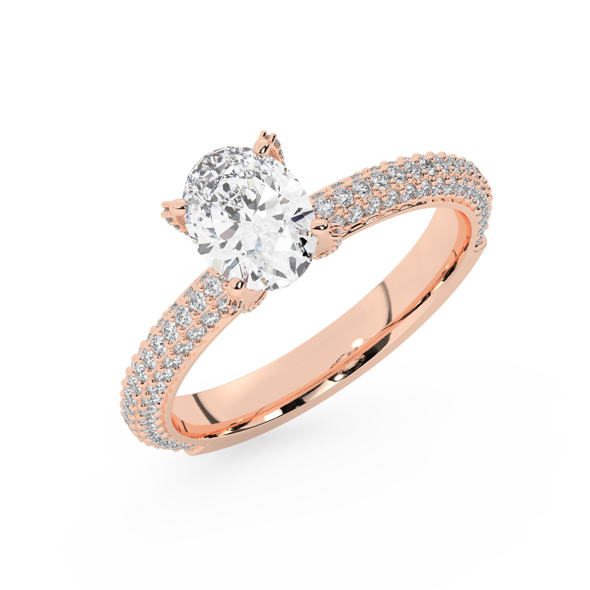 טבעת אירוסין סוליטר ויהלומים בצדדים דגם 50012 כסף מצופה זהב אדום רוזגולד במרכז יהלום מעבדה 0.75 קראט בחיתוך אובל עם תעודה גמולוגית מסביב ובצדדים יהלומי מעבדה במשקל כולל של 0.40 קראט בחיתוך עגול