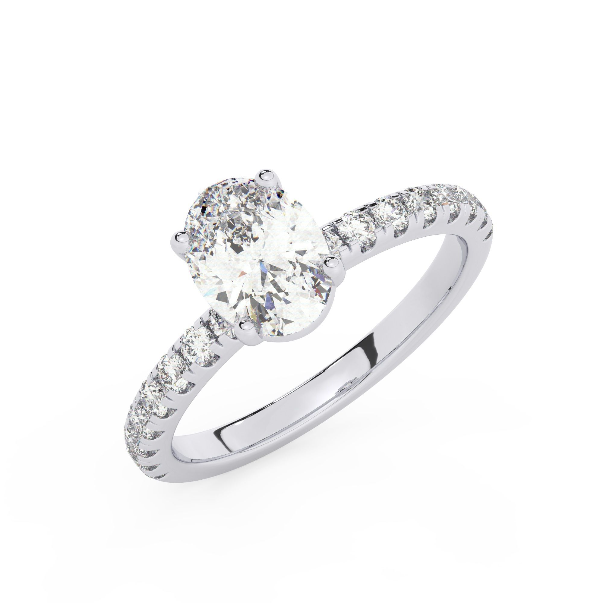 טבעת אירוסין סוליטר ויהלומים בצדדים דגם 50037 כסף מצופה זהב לבן במרכז יהלום מעבדה 0.75 קראט בחיתוך אובל עם תעודה גמולוגית מסביב ובצדדים יהלומי מעבדה במשקל כולל של 0.32 קראט בחיתוך עגול