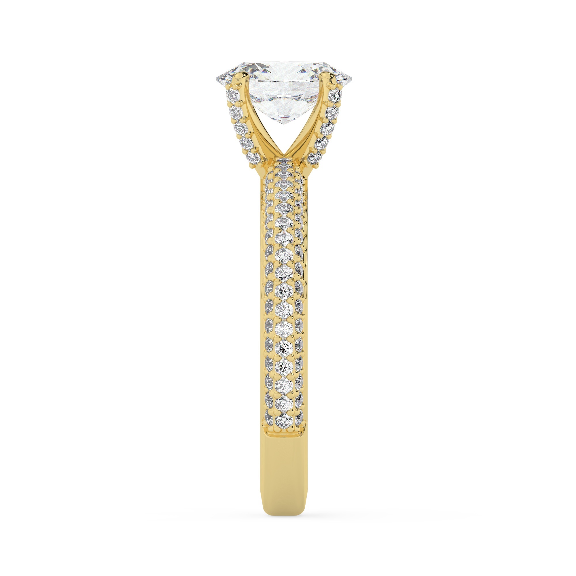 טבעת אירוסין סוליטר ויהלומים בצדדים דגם 50012 כסף מצופה זהב צהוב במרכז יהלום מעבדה 0.75 קראט בחיתוך אובל עם תעודה גמולוגית מסביב ובצדדים יהלומי מעבדה במשקל כולל של 0.40 קראט בחיתוך עגול