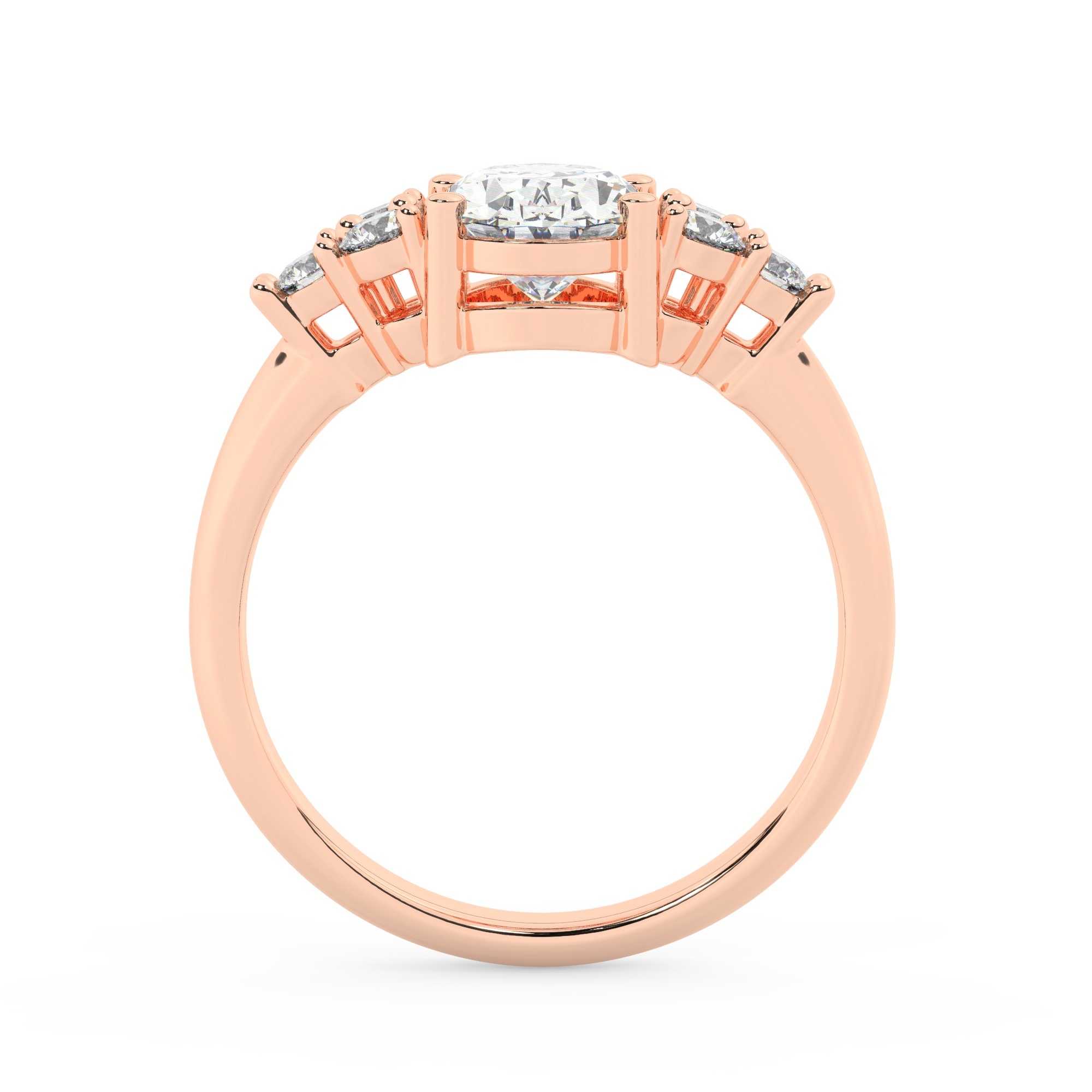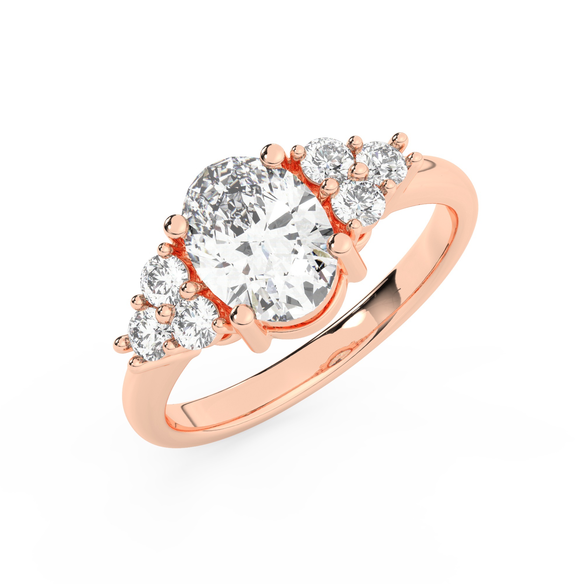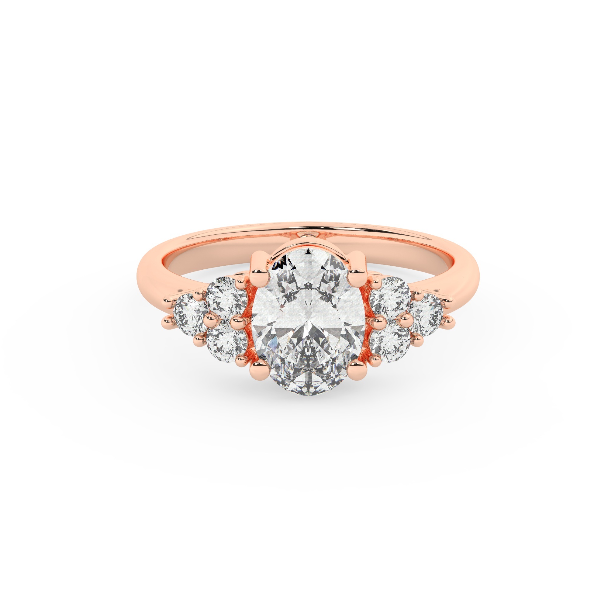 טבעת אירוסין סוליטר ויהלומים בצדדים דגם 50041 כסף מצופה זהב אדום רוזגולד במרכז יהלום מעבדה 1 קראט בחיתוך אובל עם תעודה גמולוגית אירופאית IGI מסביב ובצדדים יהלומי מעבדה במשקל כולל של 0.30 קראט בחיתוך עגול