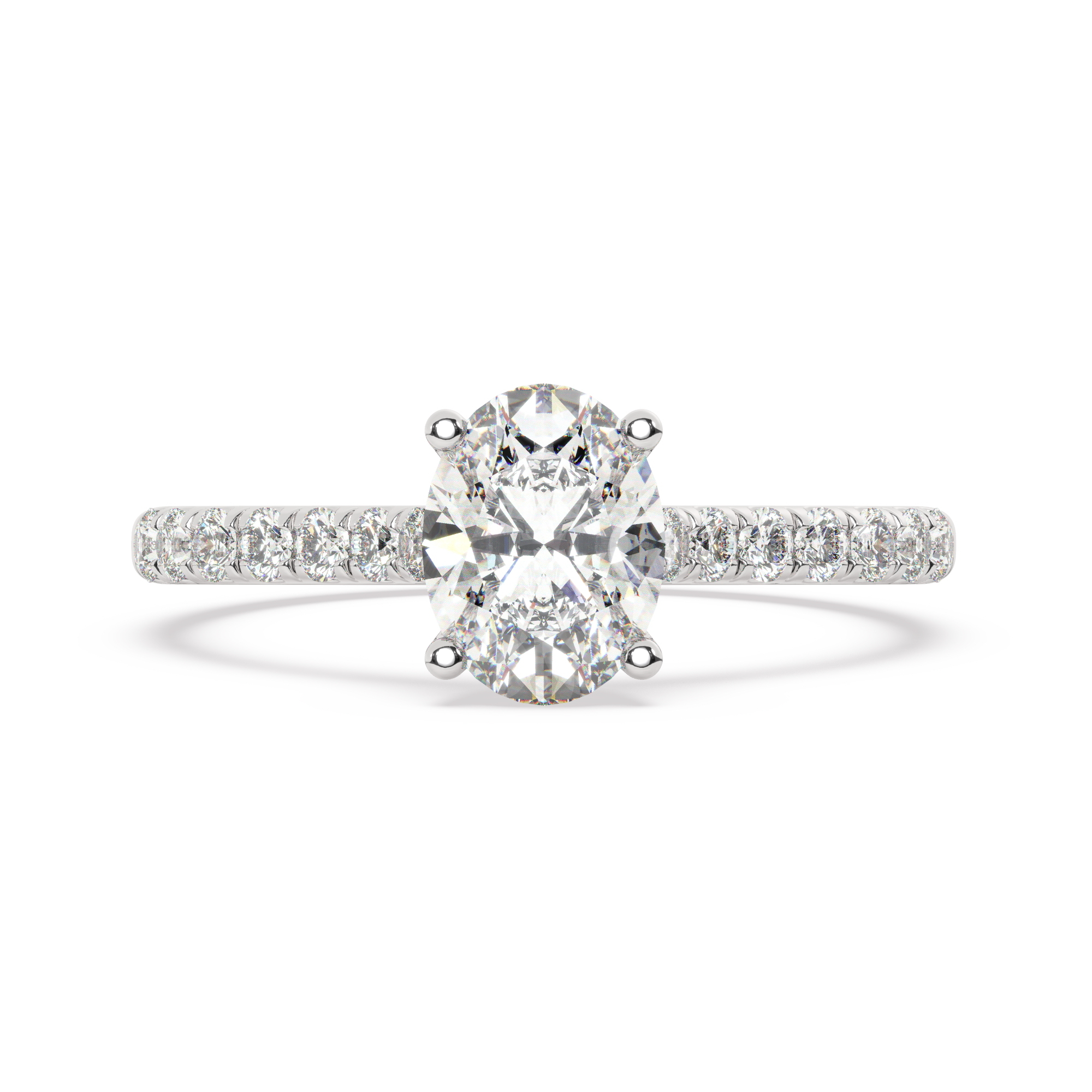 טבעת אירוסין סוליטר ויהלומים בצדדים דגם 50019 כסף מצופה זהב לבן במרכז יהלום מעבדה 1 קראט בחיתוך אובל עם תעודה גמולוגית אירופאית IGI מסביב ובצדדים יהלומי מעבדה במשקל כולל של 0.28 קראט בחיתוך עגול