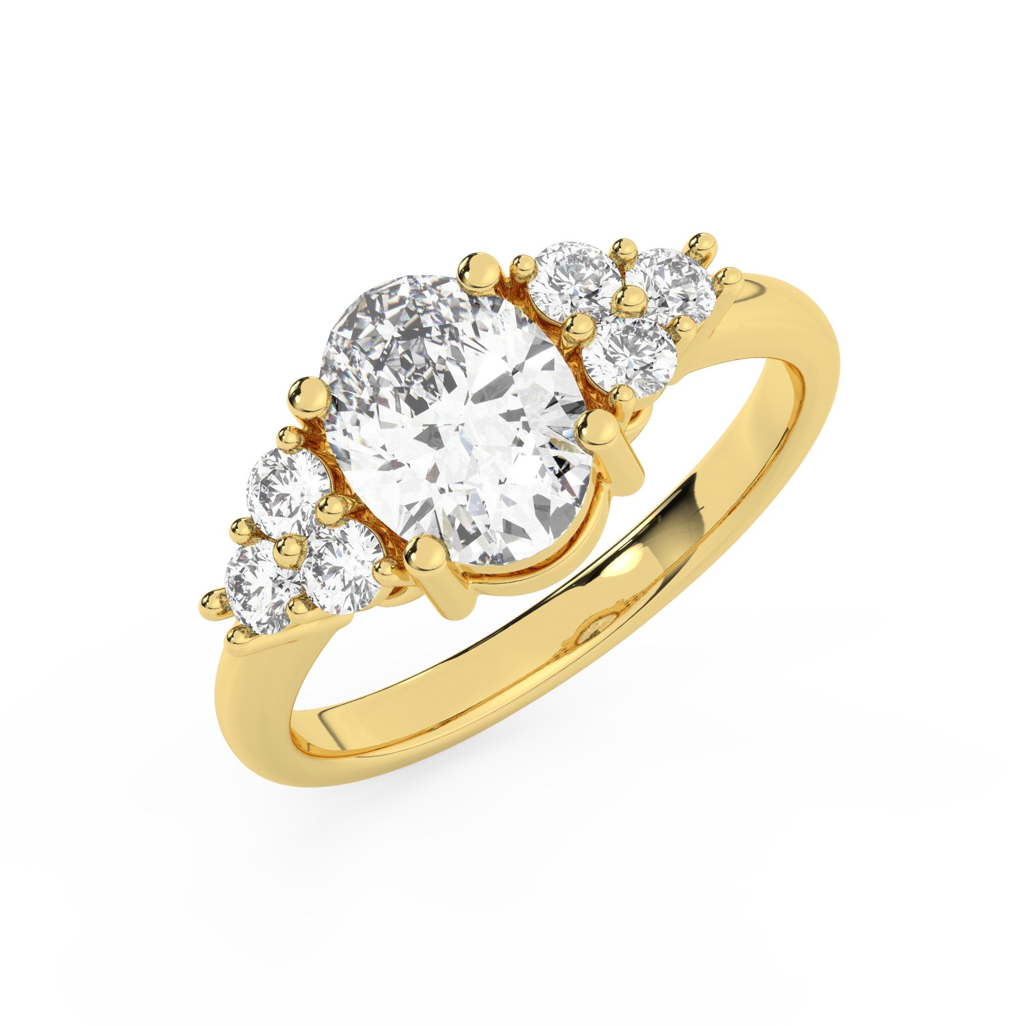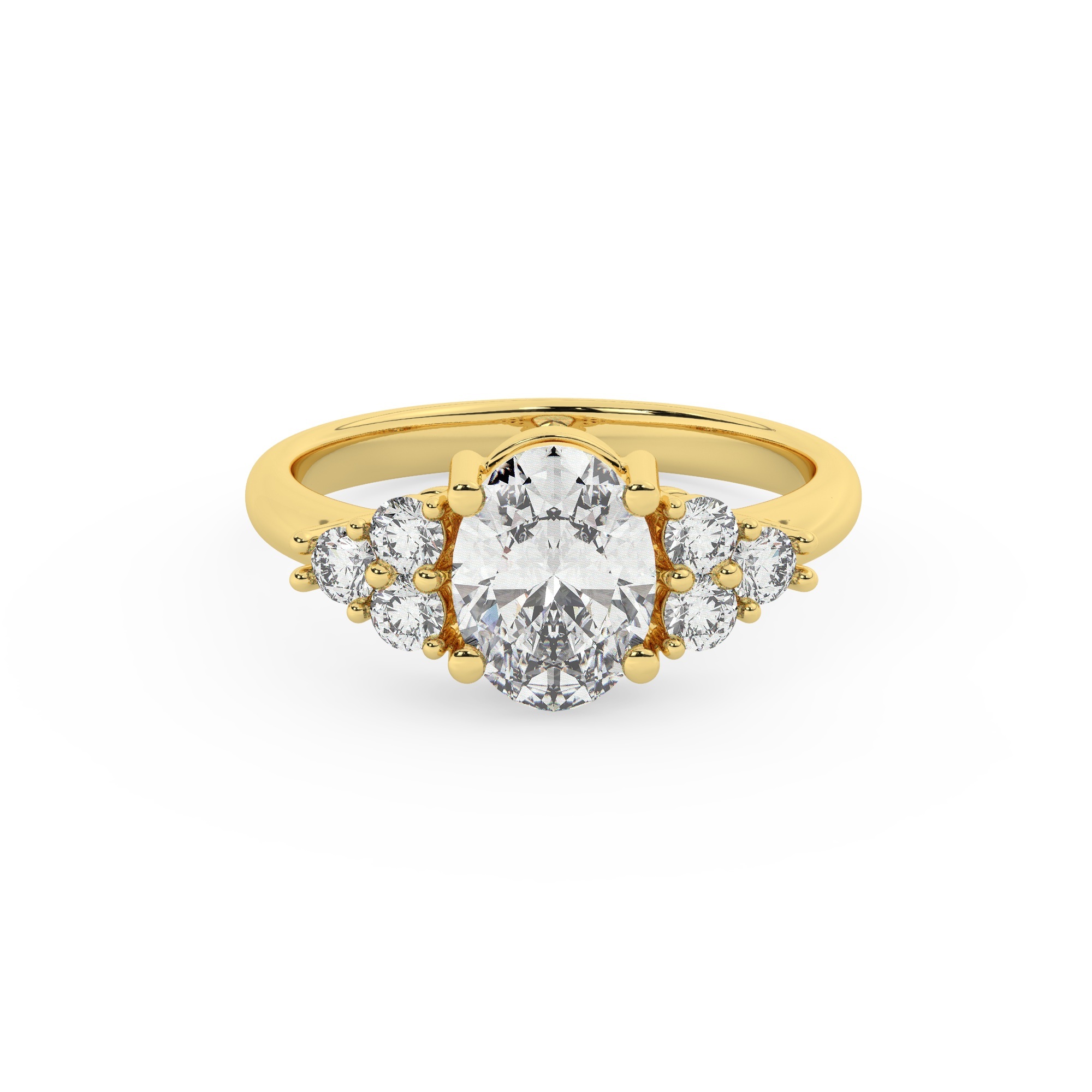 טבעת אירוסין סוליטר ויהלומים בצדדים דגם 50041 כסף מצופה זהב צהוב במרכז יהלום מעבדה 1 קראט בחיתוך אובל עם תעודה גמולוגית אירופאית IGI מסביב ובצדדים יהלומי מעבדה במשקל כולל של 0.30 קראט בחיתוך עגול