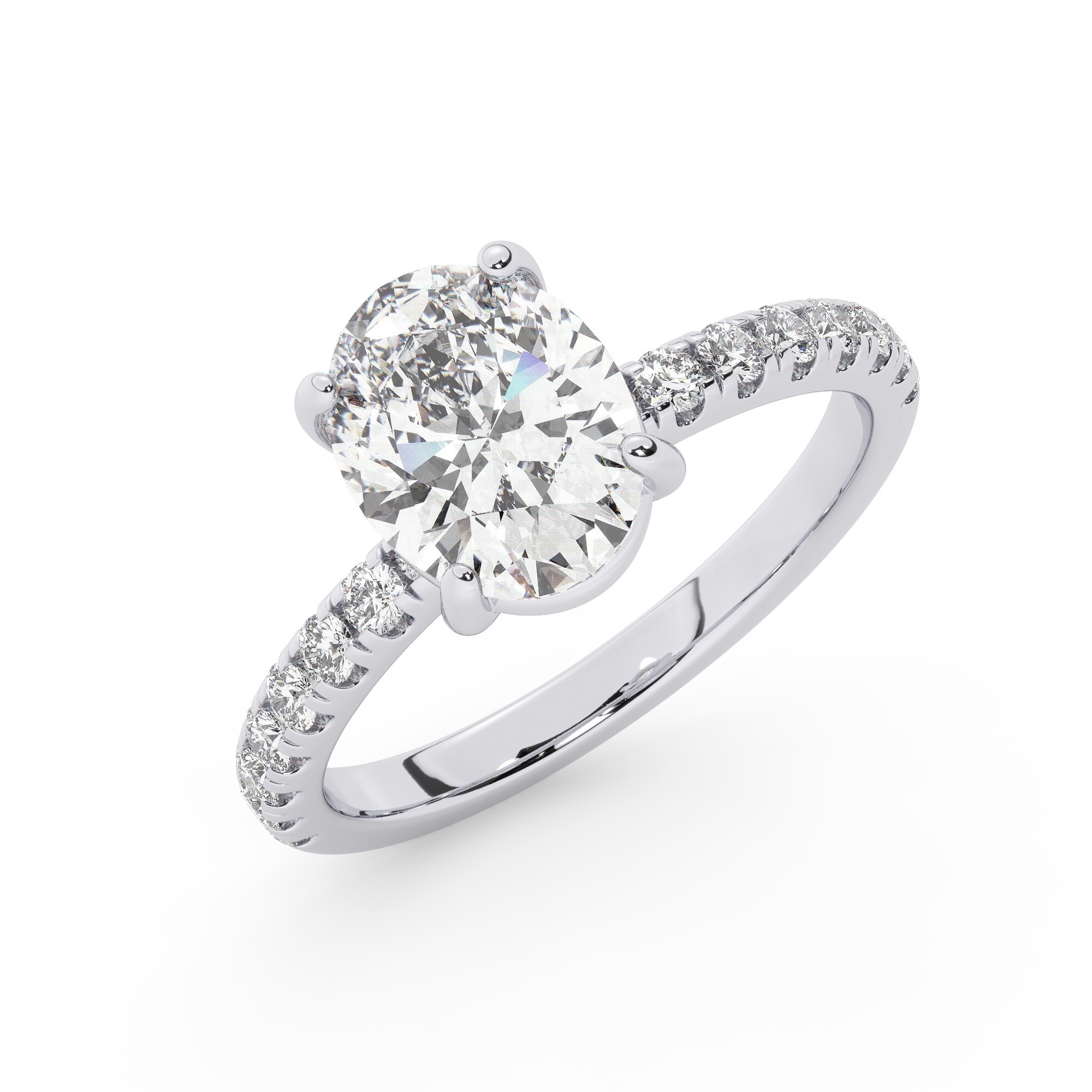 טבעת אירוסין סוליטר ויהלומים בצדדים דגם 50037 כסף מצופה זהב לבן במרכז יהלום מעבדה 2 קראט בחיתוך אובל עם תעודה גמולוגית אירופאית IGI מסביב ובצדדים יהלומי מעבדה במשקל כולל של 0.32 קראט בחיתוך עגול
